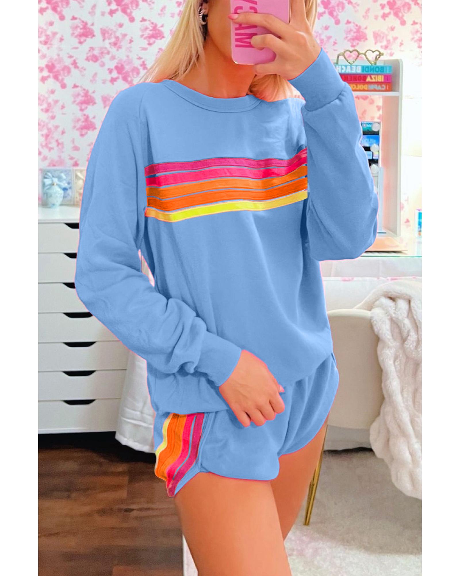 This casual two-piece set features a stylish striped accent on both the pullover and shorts, offering a trendy and comfortable look suitable for warm weather or indoor lounging. The coordinated design makes it versatile for dressing up or down, making it ideal for everyday wear.