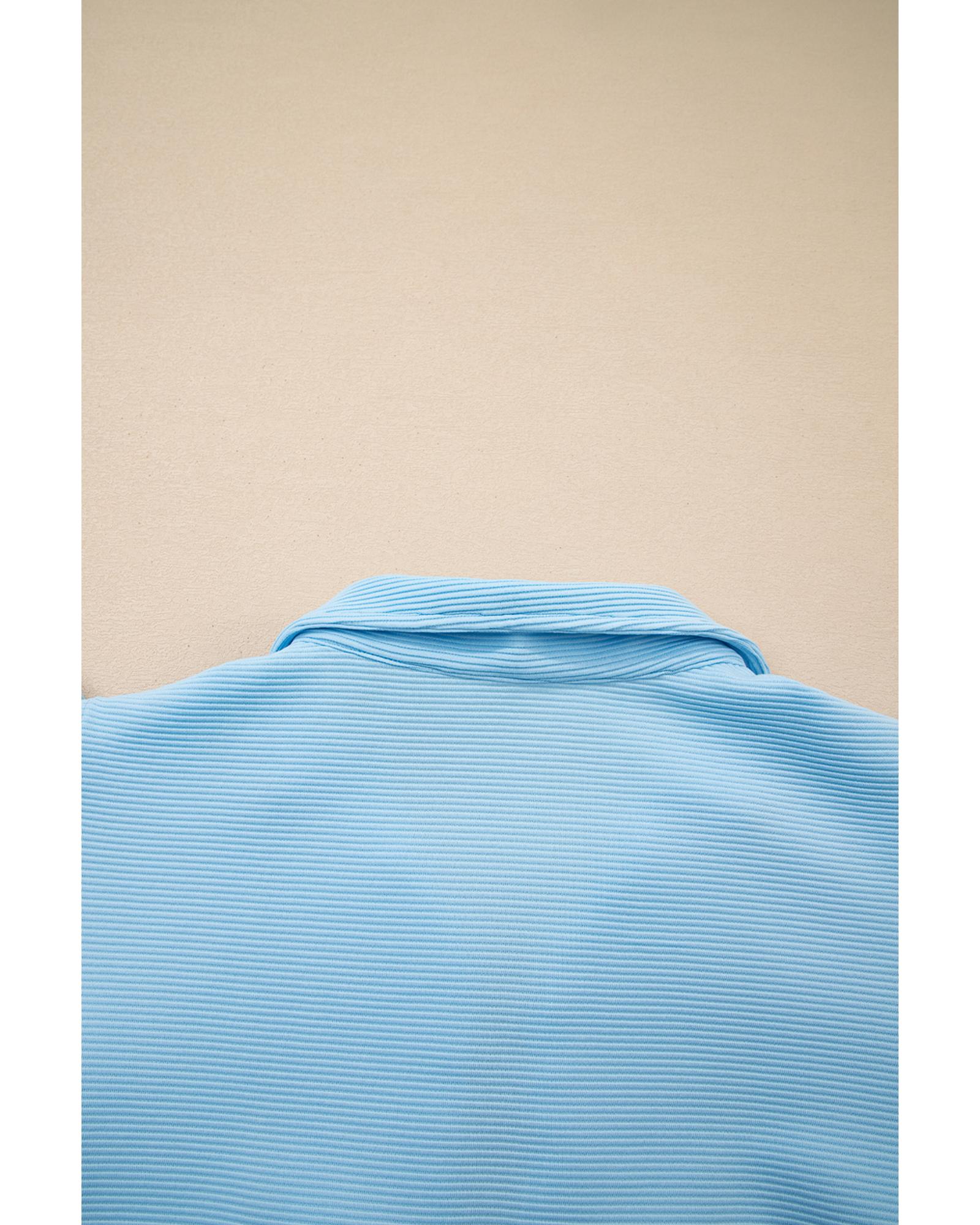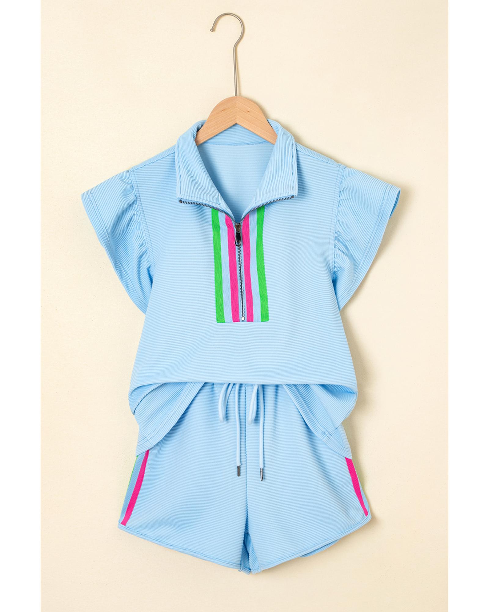 Beau Blue Striped Detail Flutter Sleeve Zipped Collar Short Set – L