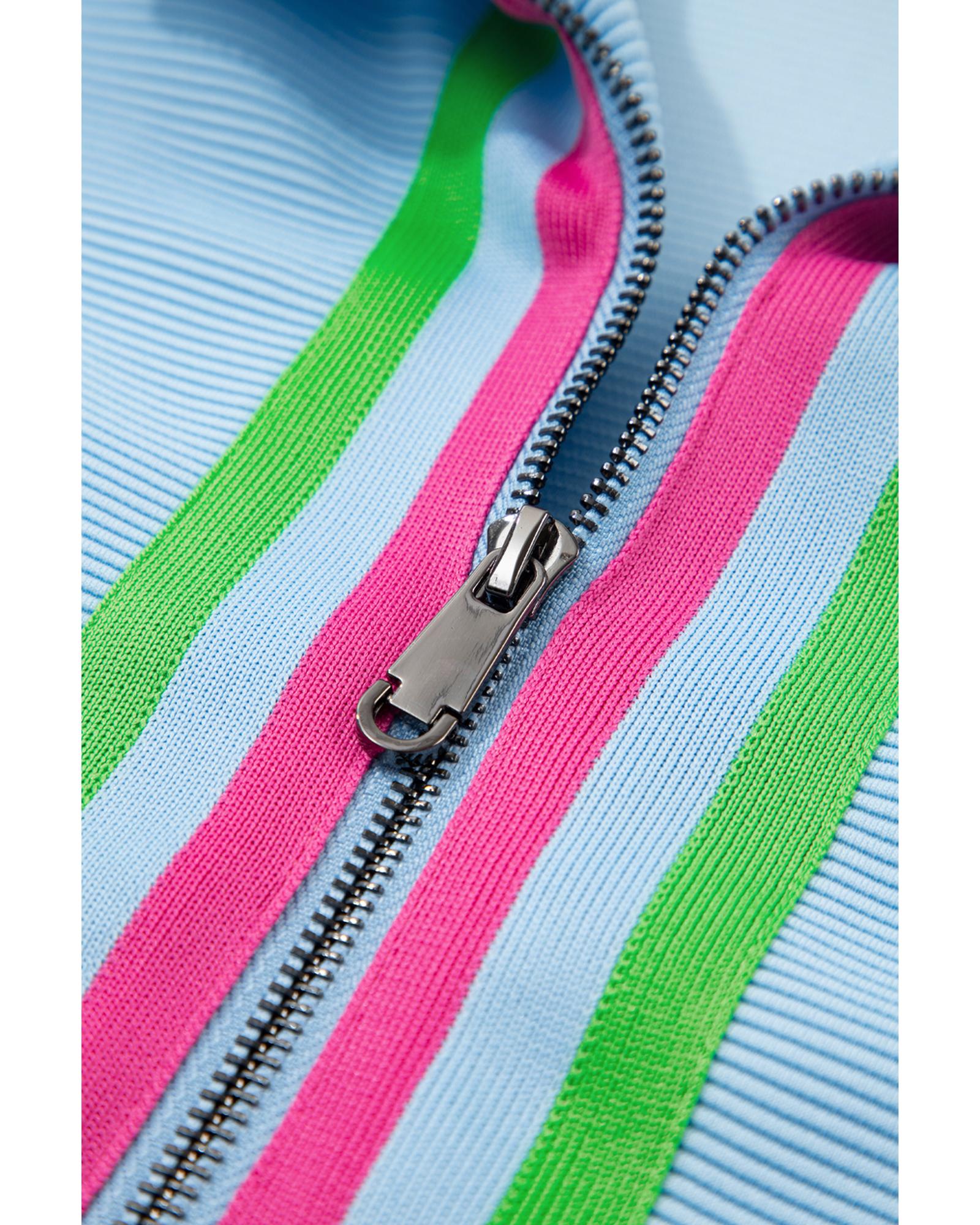 • The top has a zipped collar with striped accents and ruffled sleeves for a fashionable look.