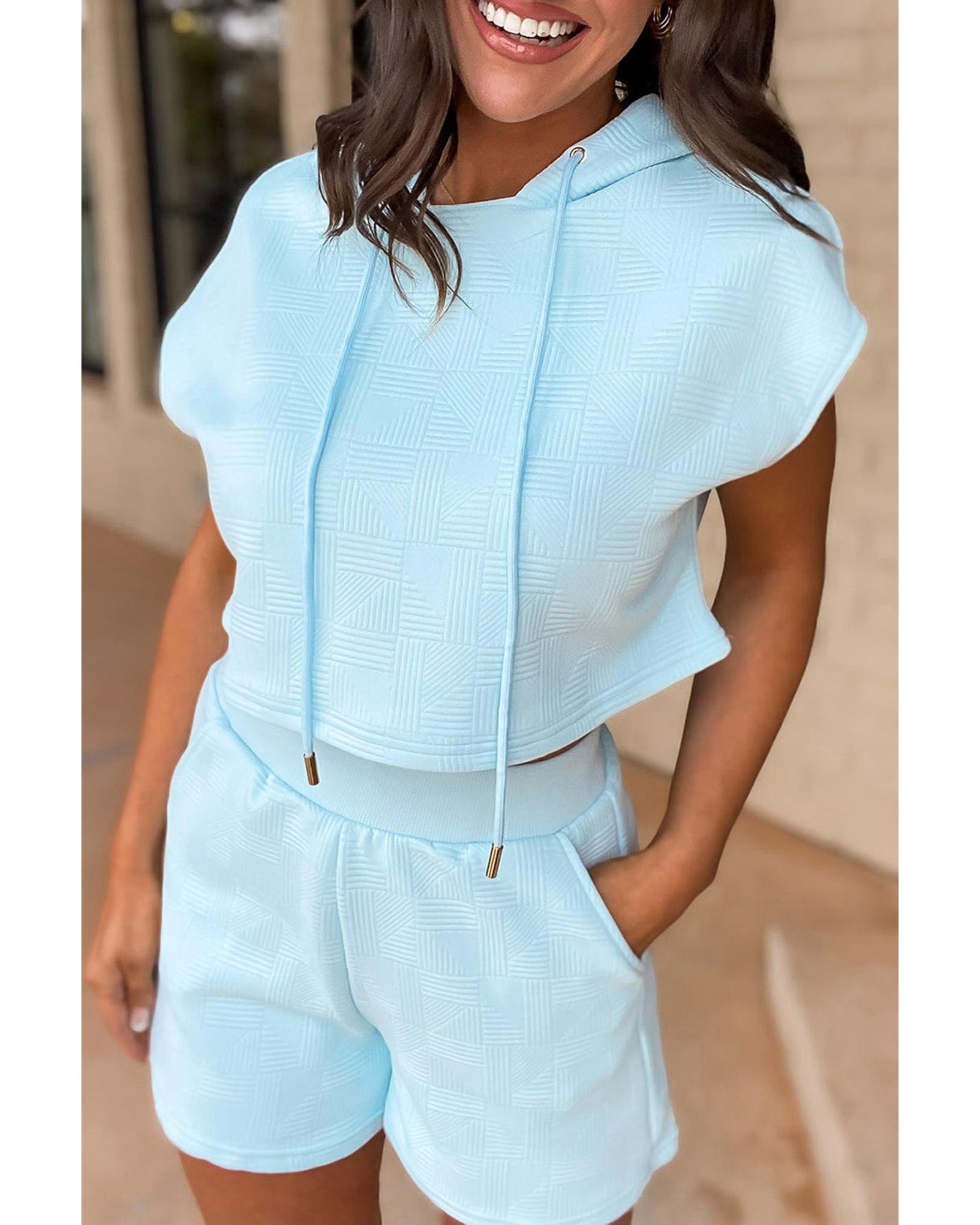 This textured cropped hoodie and shorts set offers a trendy and fitted look, designed to provide both style and comfort. Crafted with attention to detail, it features a sophisticated and versatile design suitable for various occasions. The set combines contemporary fashion with timeless elegance, making it a fashionable choice for everyday wear.