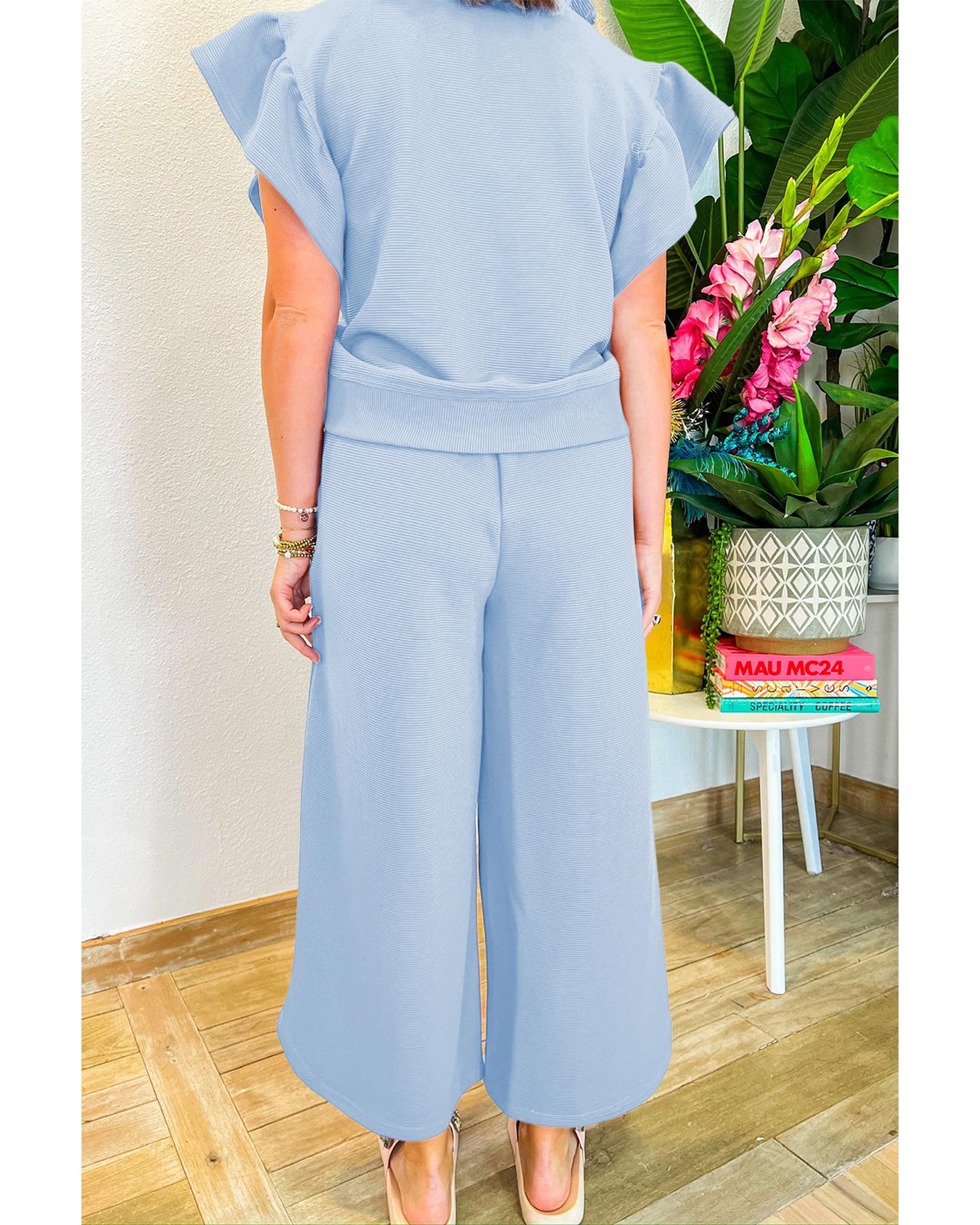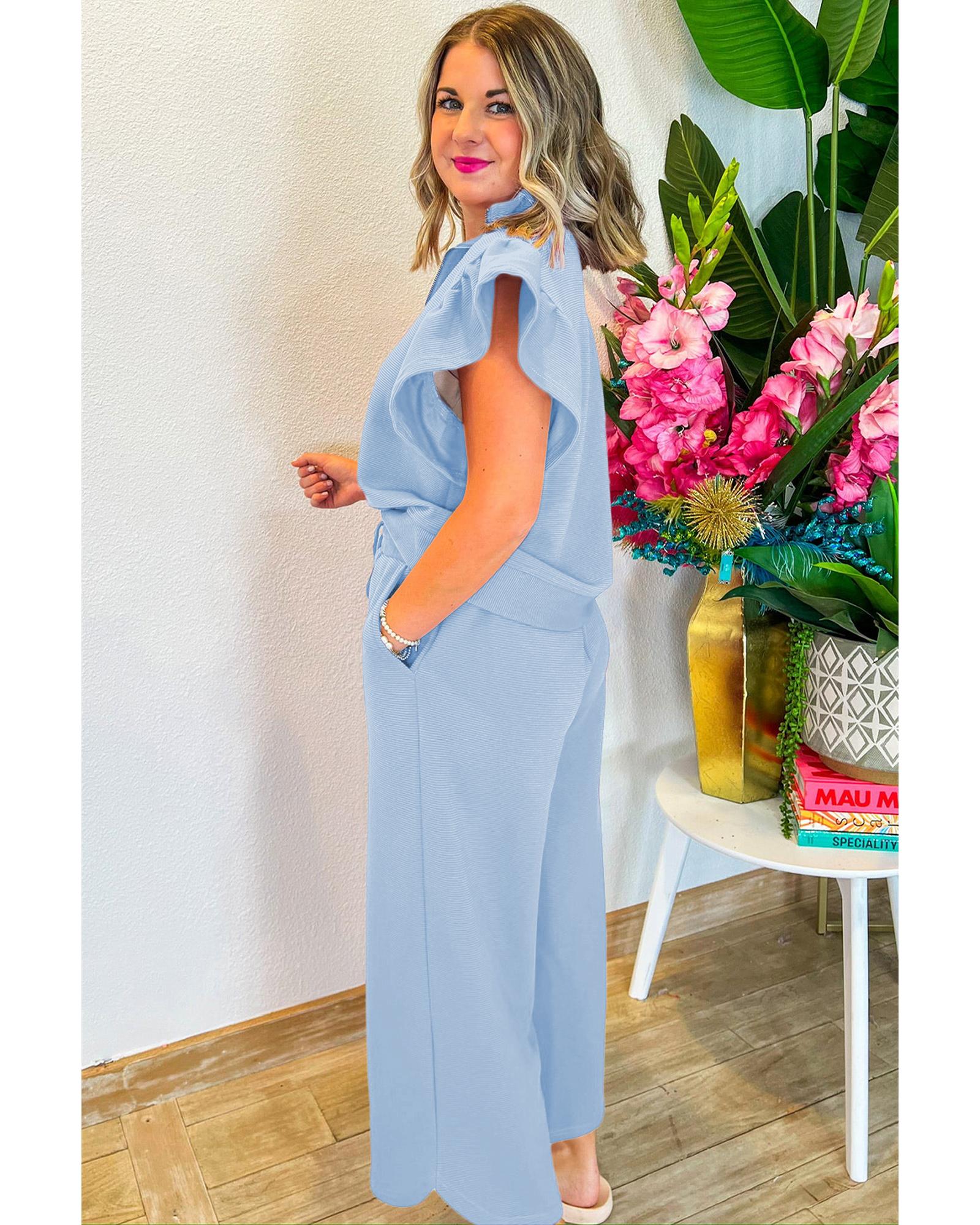 Beau Blue Textured Ruffled Sleeve Zipped Top and Wide Leg Pants Set – XL