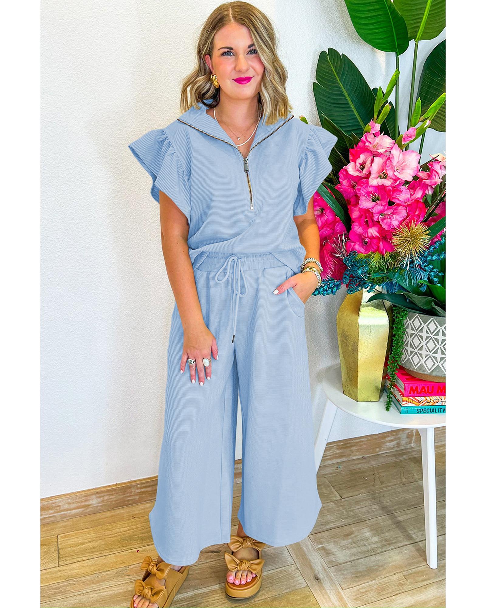 This stylish two-piece set features a textured ruffled sleeve top with a zippered neckline and wide-leg pants, offering a chic and comfortable look suitable for various occasions. The solid color design enhances its sleek and sophisticated appearance, making it a versatile addition to your wardrobe.