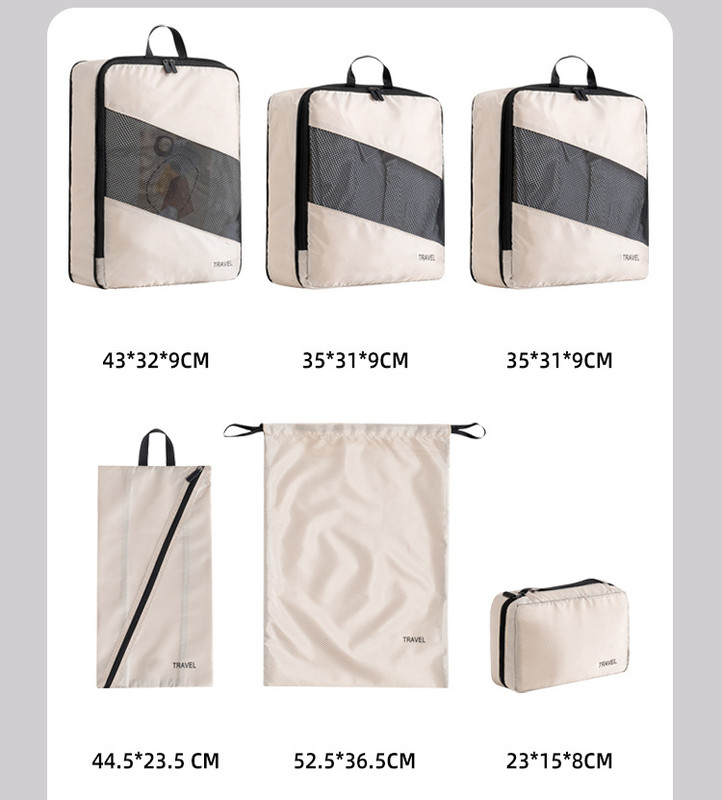 Beige and Black Premium 6-Piece Compression Packing Cubes Set – Lightweight Polyester Travel Organizers for Luggage, Includes Shoe Bag & Toiletry Pouch