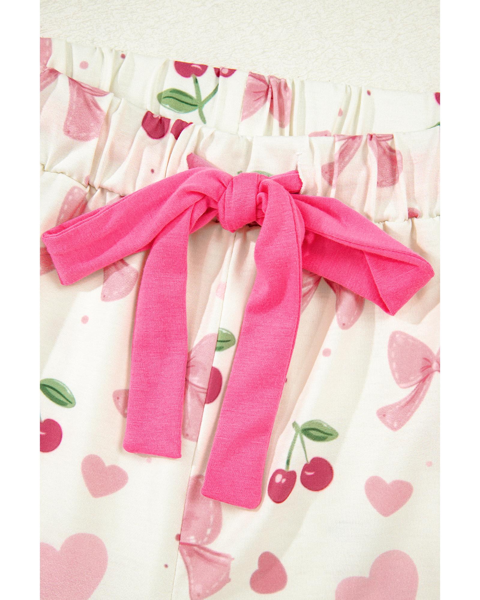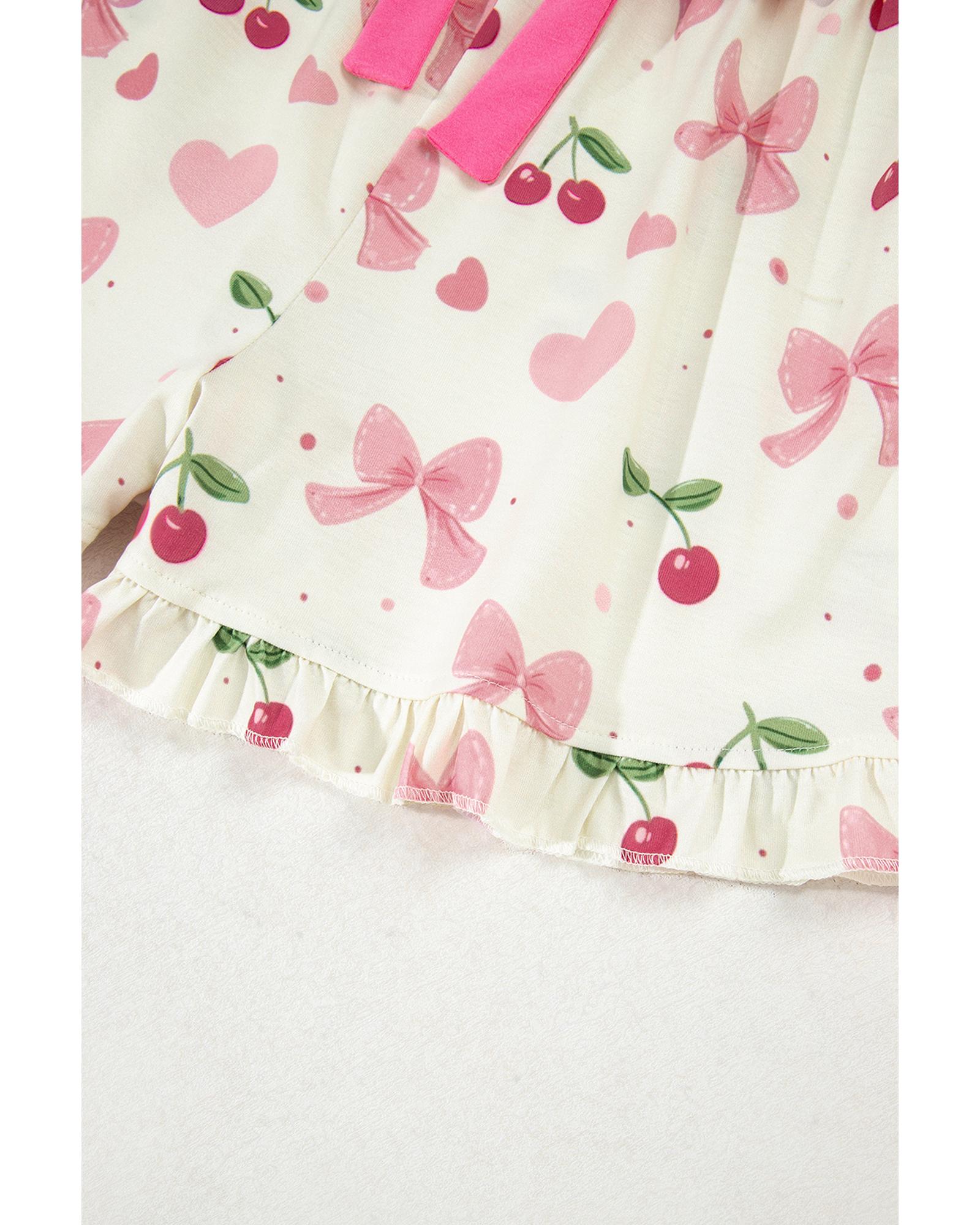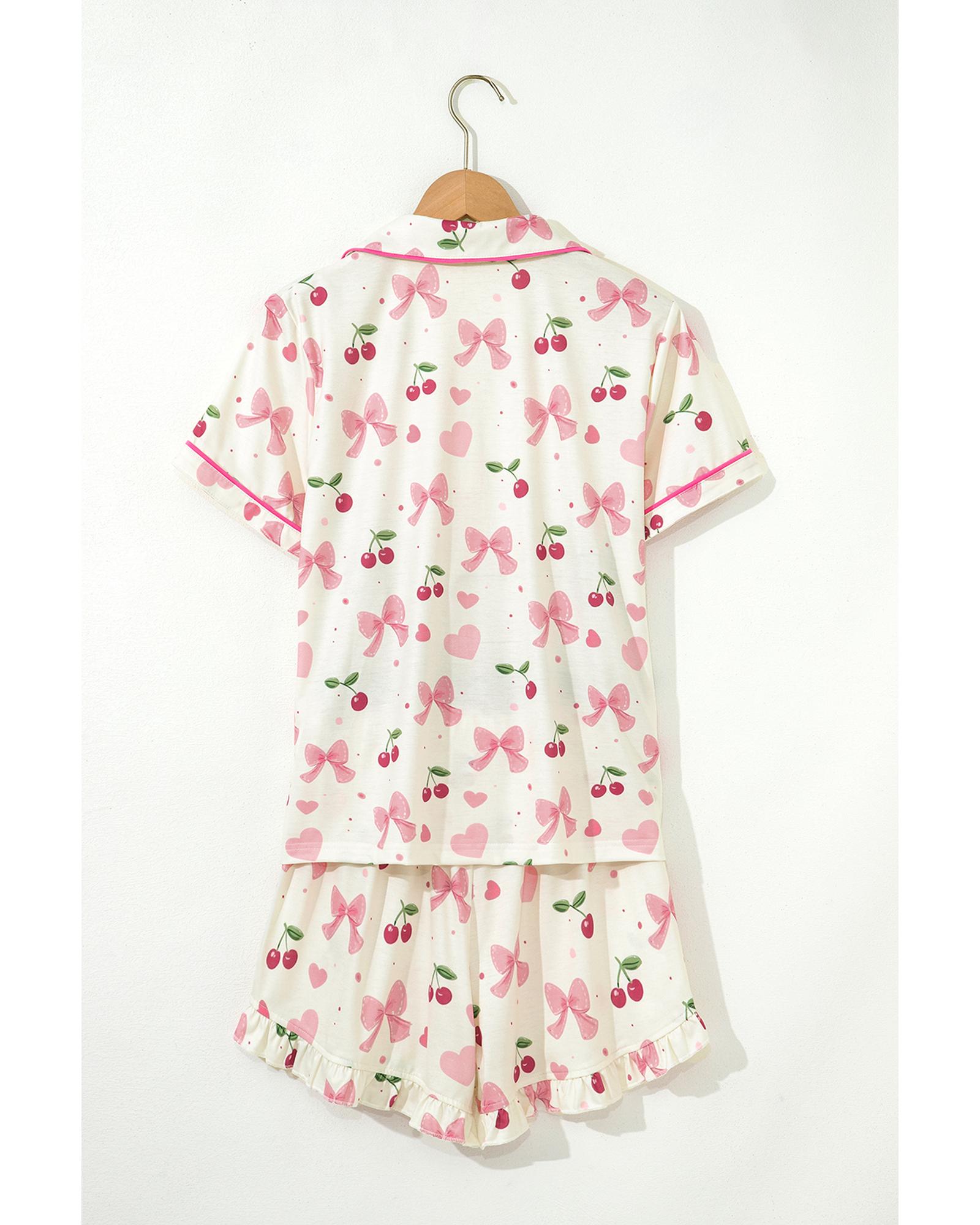 Beige Bow Fruit Print Contrast Pipping Short Pajamas Set – L