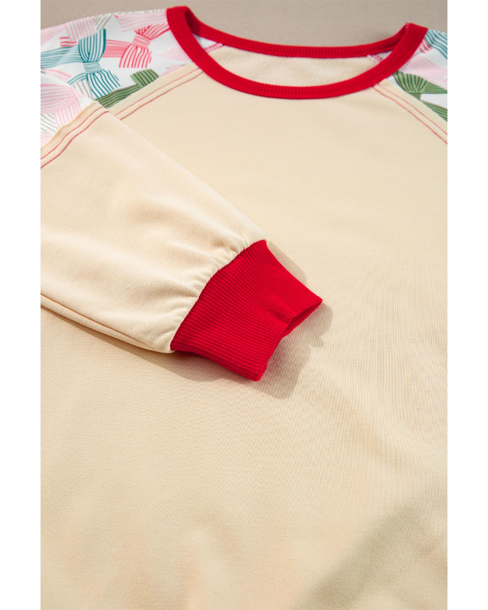 Beige Bowknot Printed Patchwork Raglan Sleeve Colorblock Edge Top – XL
