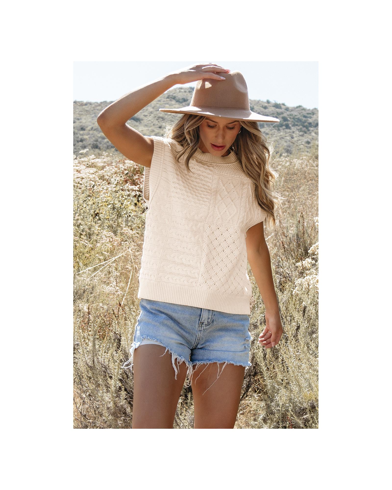 This beige cable knit tank top features a trendy and relaxed fit with dolman armholes, making it suitable for warm weather. Its classic design and high-quality material ensure durability and style, perfect for casual wear or layering.