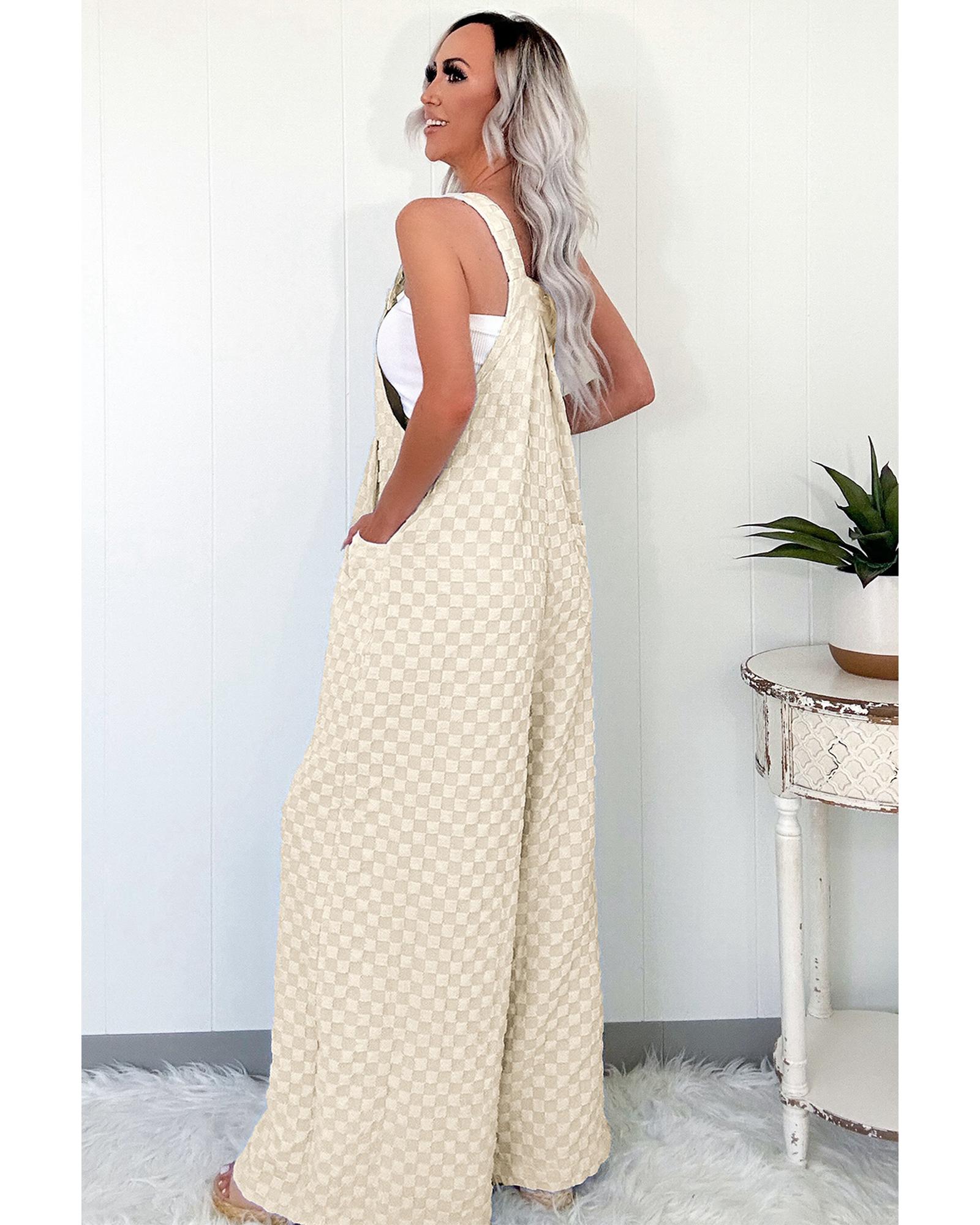 This beige checkered pocketed high waist wide leg overall offers a stylish and comfortable look. Designed with a high waist and wide leg fit, it provides a flattering silhouette suitable for various occasions. The sleeveless jumpsuit features functional bib pockets, combining practicality with fashion.