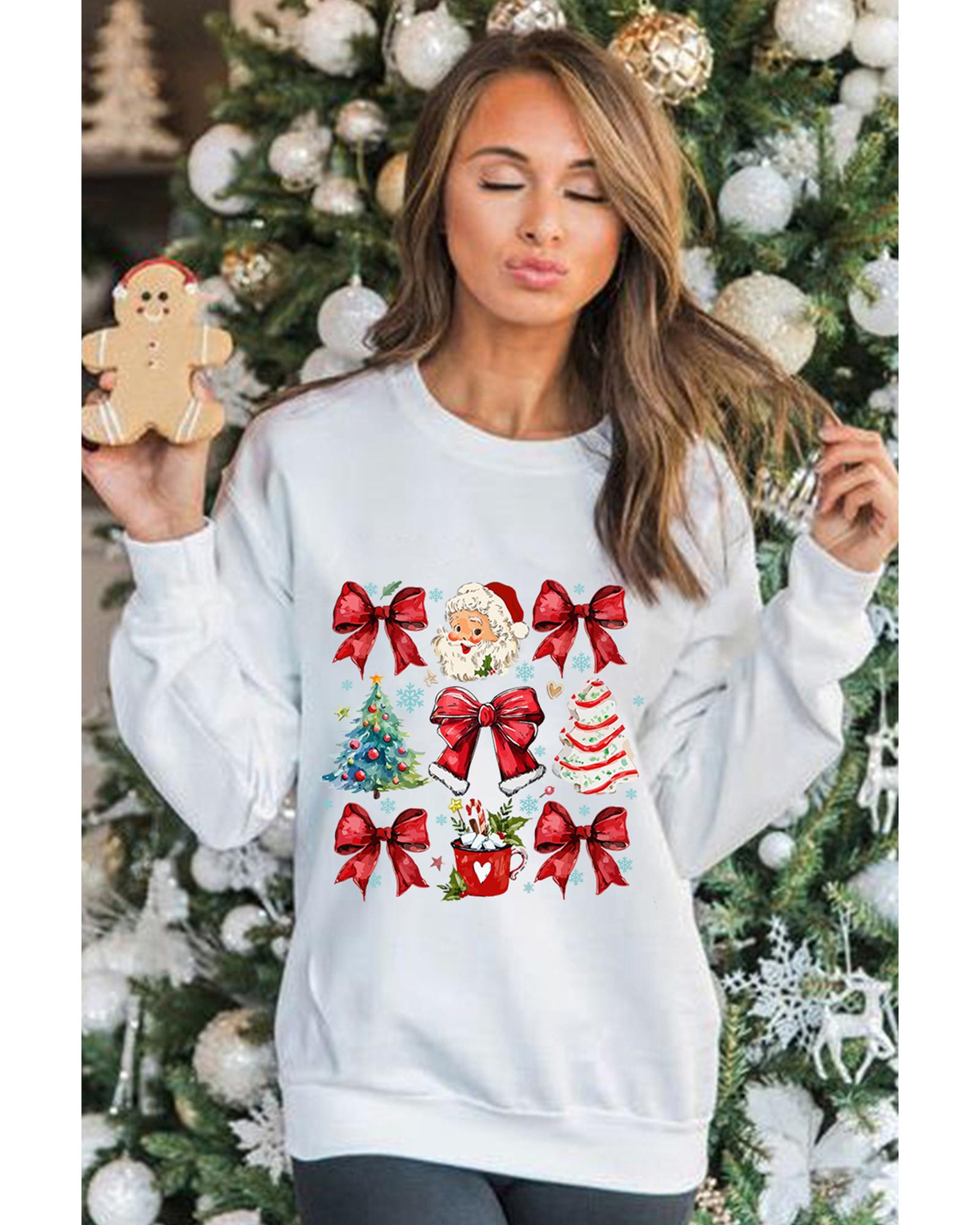 This festive sweatshirt features a cheerful Santa Claus graphic along with classic Christmas tree and bowknot designs, making it perfect for holiday celebrations. Designed with a trendy fitted look, it offers both style and comfort for the holiday season.