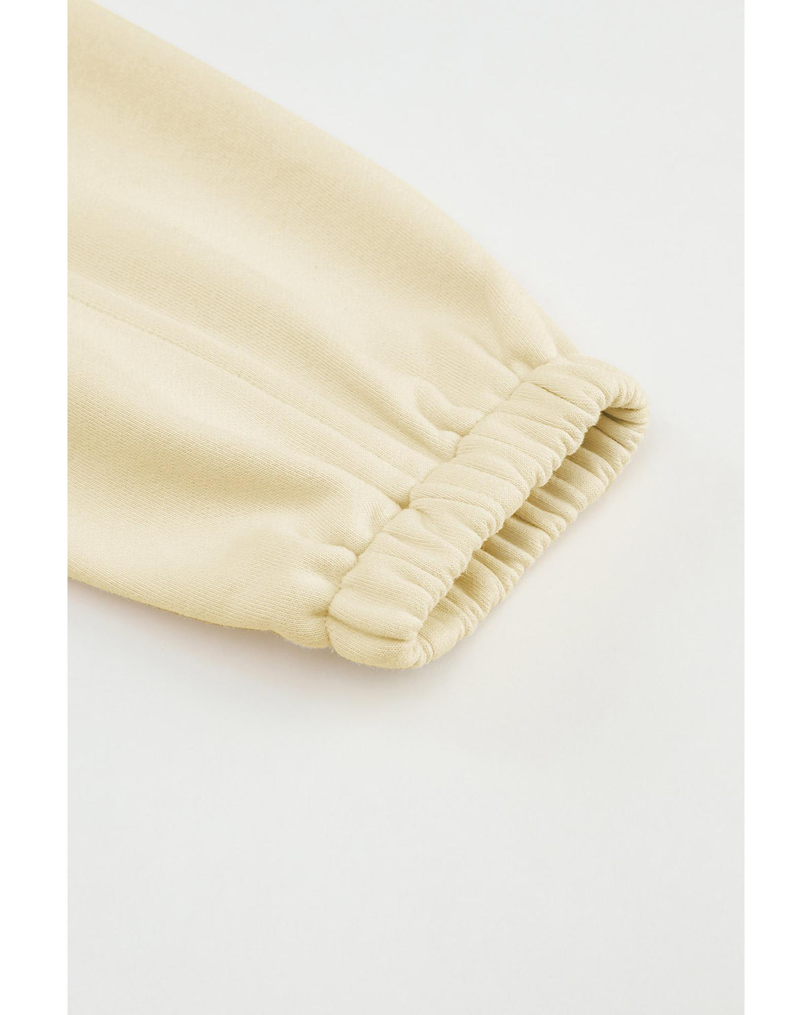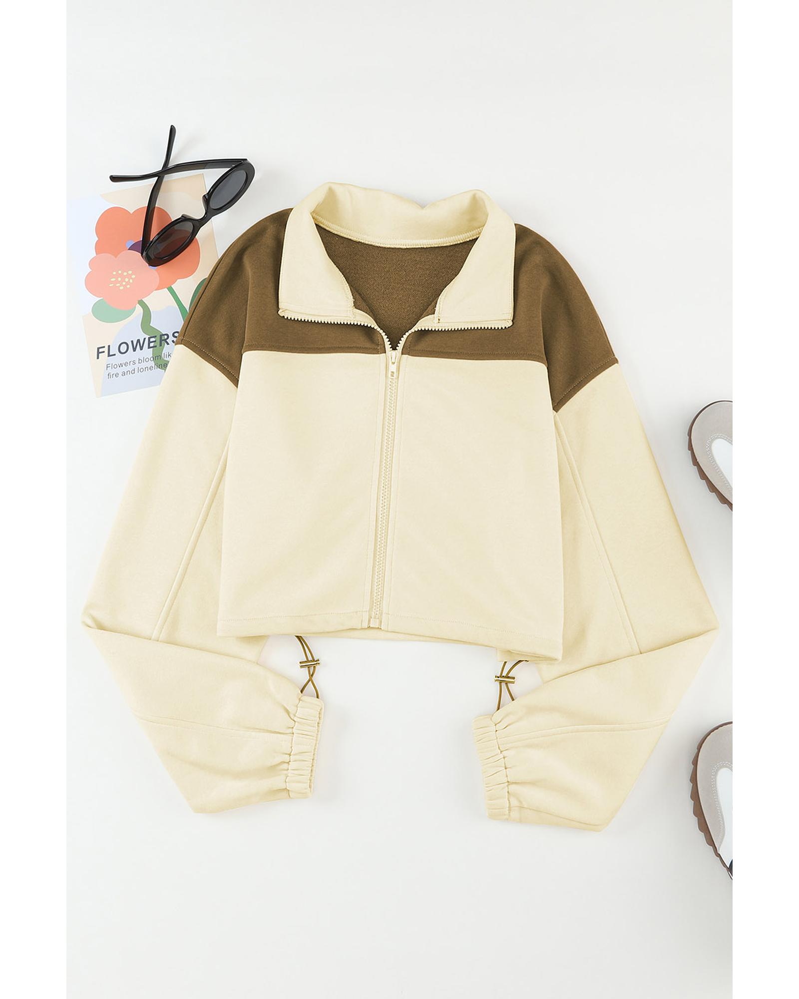 This beige color block cropped athleisure jacket features a trendy fitted design with a drawstring waist, offering a stylish and comfortable fit. Its versatile unisex style makes it suitable for various casual occasions, combining fashion with functionality.