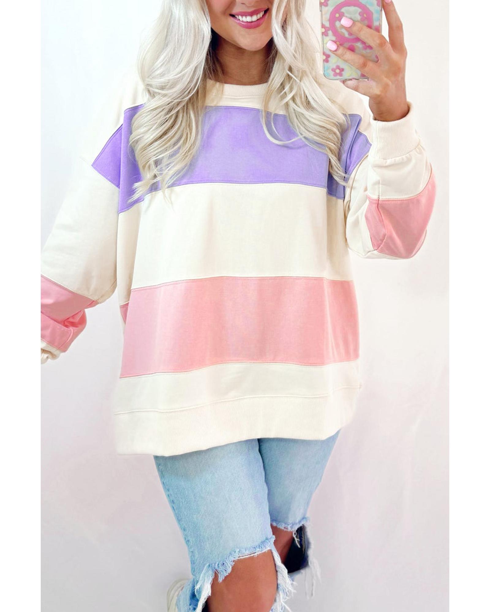 This beige colorblock patchwork sweatshirt features a relaxed drop shoulder design, offering a casual and trendy look. Made from soft and cozy fabric, it provides all-day comfort and is suitable for various casual occasions. The high elasticity ensures a comfortable fit, making it a versatile addition to your wardrobe.