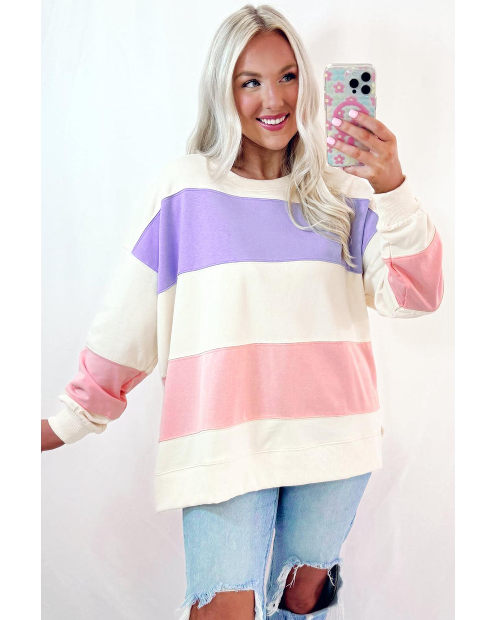 Beige Colorblock Patchwork Drop Shoulder Crewneck Sweatshirt – L