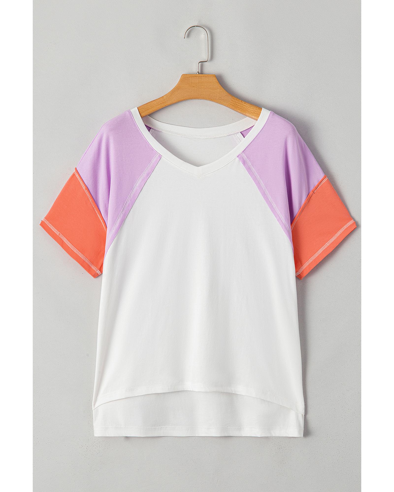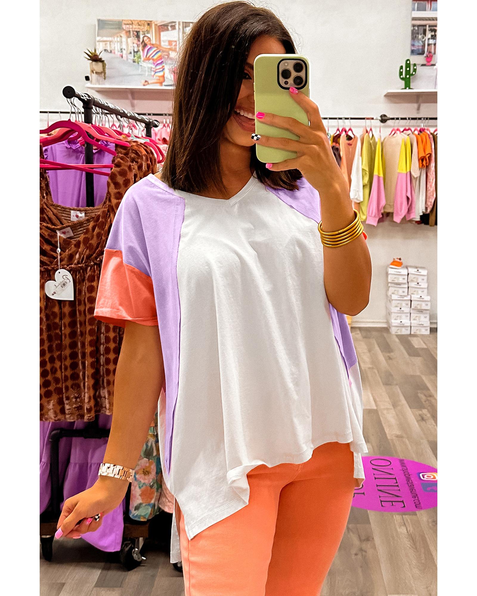 This beige colorblock patchwork T-shirt features a stylish V-neck and an eye-catching exposed seam design. The high-low hemline adds an asymmetrical touch, creating a modern and fashionable silhouette. Crafted from a comfortable blend of cotton and elastane, it offers both style and ease of wear.