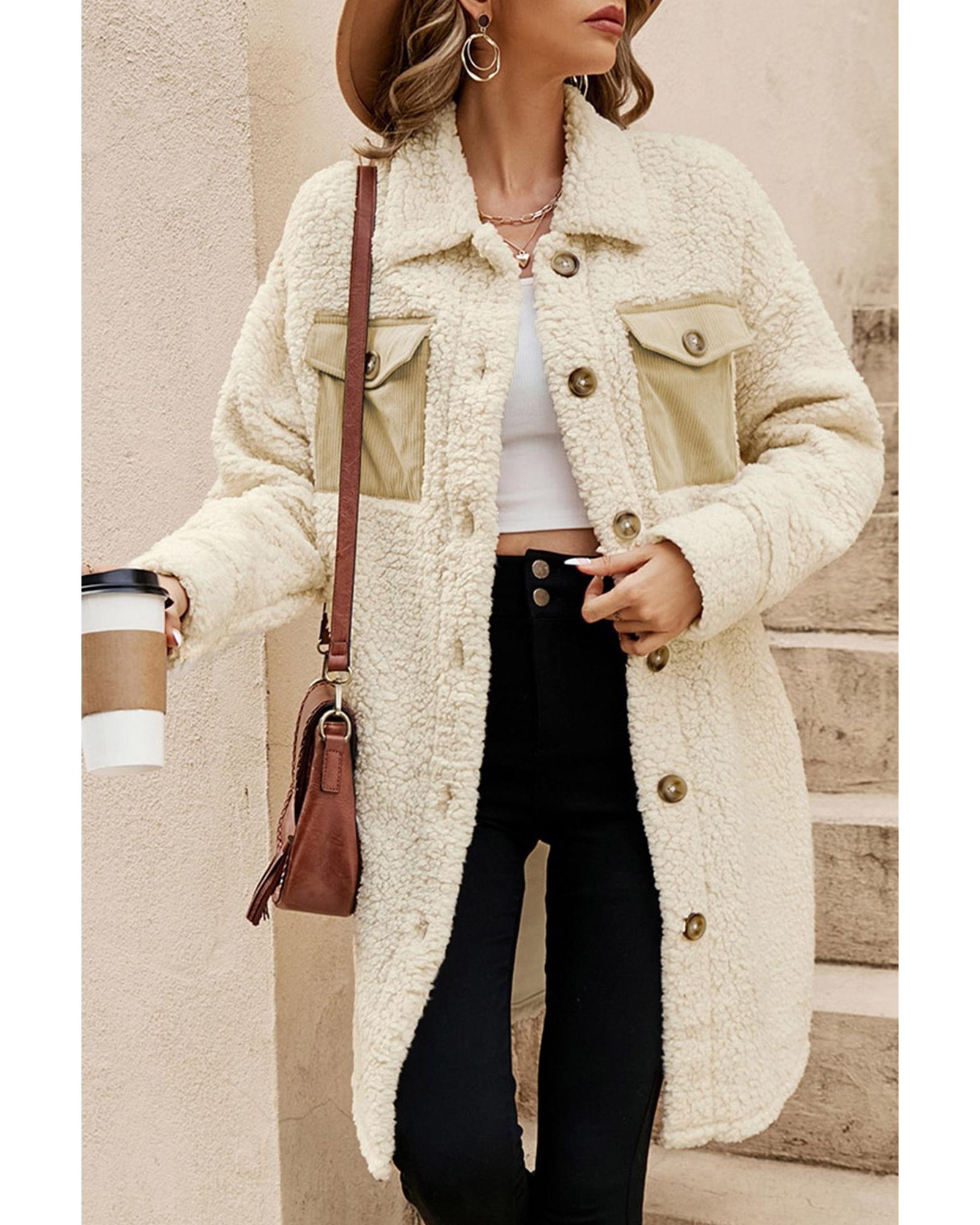 This beige teddy coat features a stylish contrast flap pocket design and a single-breasted closure, making it a versatile and fashionable choice for winter wear. Its long length provides warmth and comfort, perfect for cold weather. The coat pairs well with casual outfits such as jeans or leggings, offering both style and practicality.