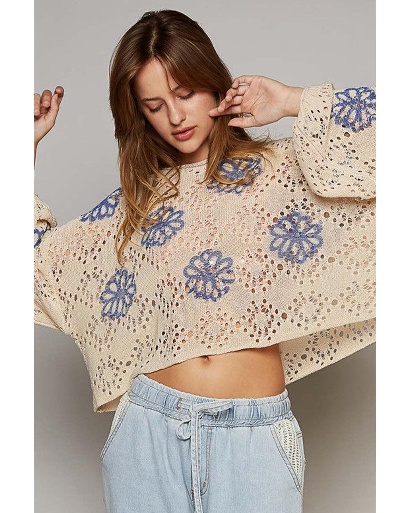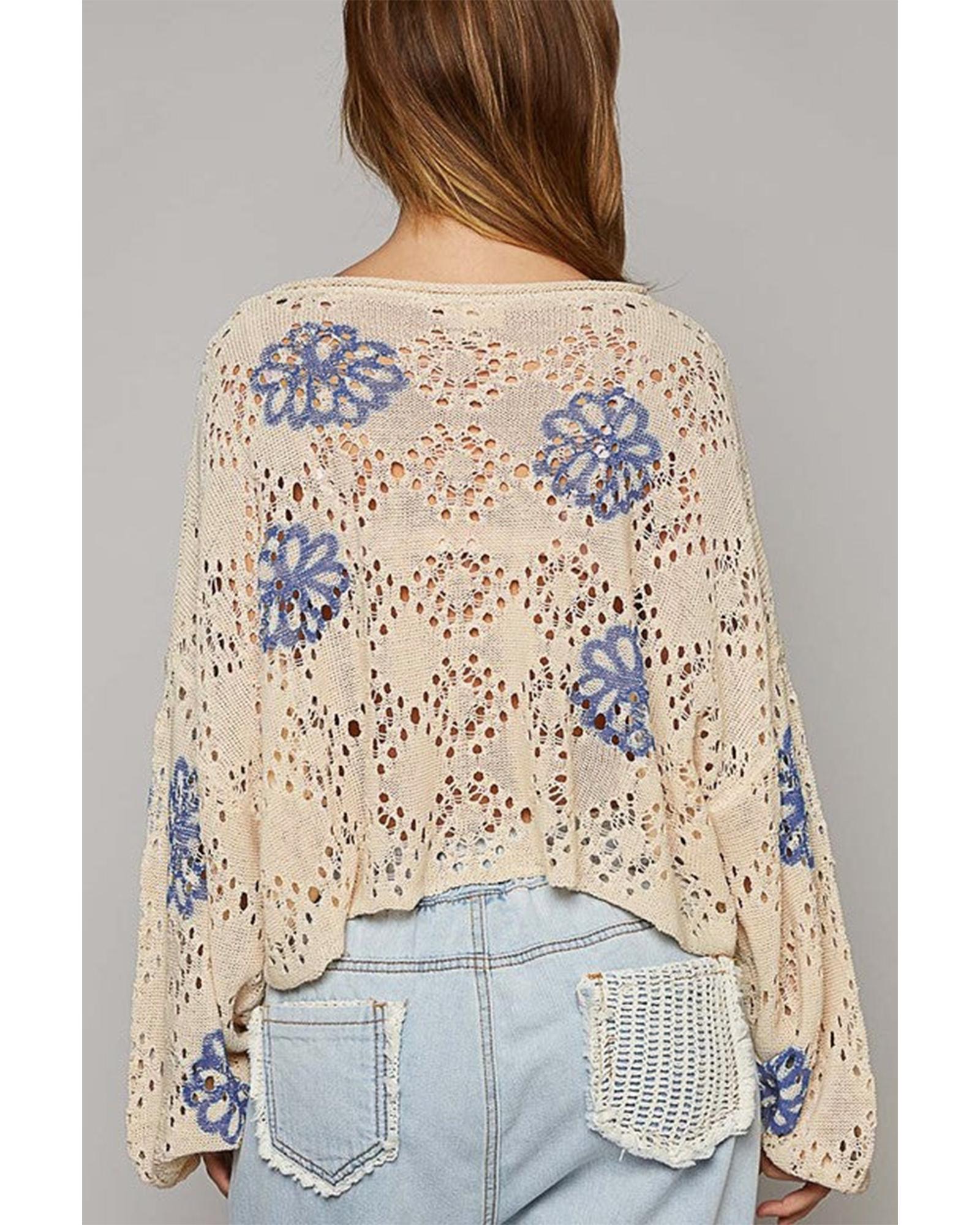 Beige Contrast Flower Print Eyelet Drop Shoulder Sweater – L
