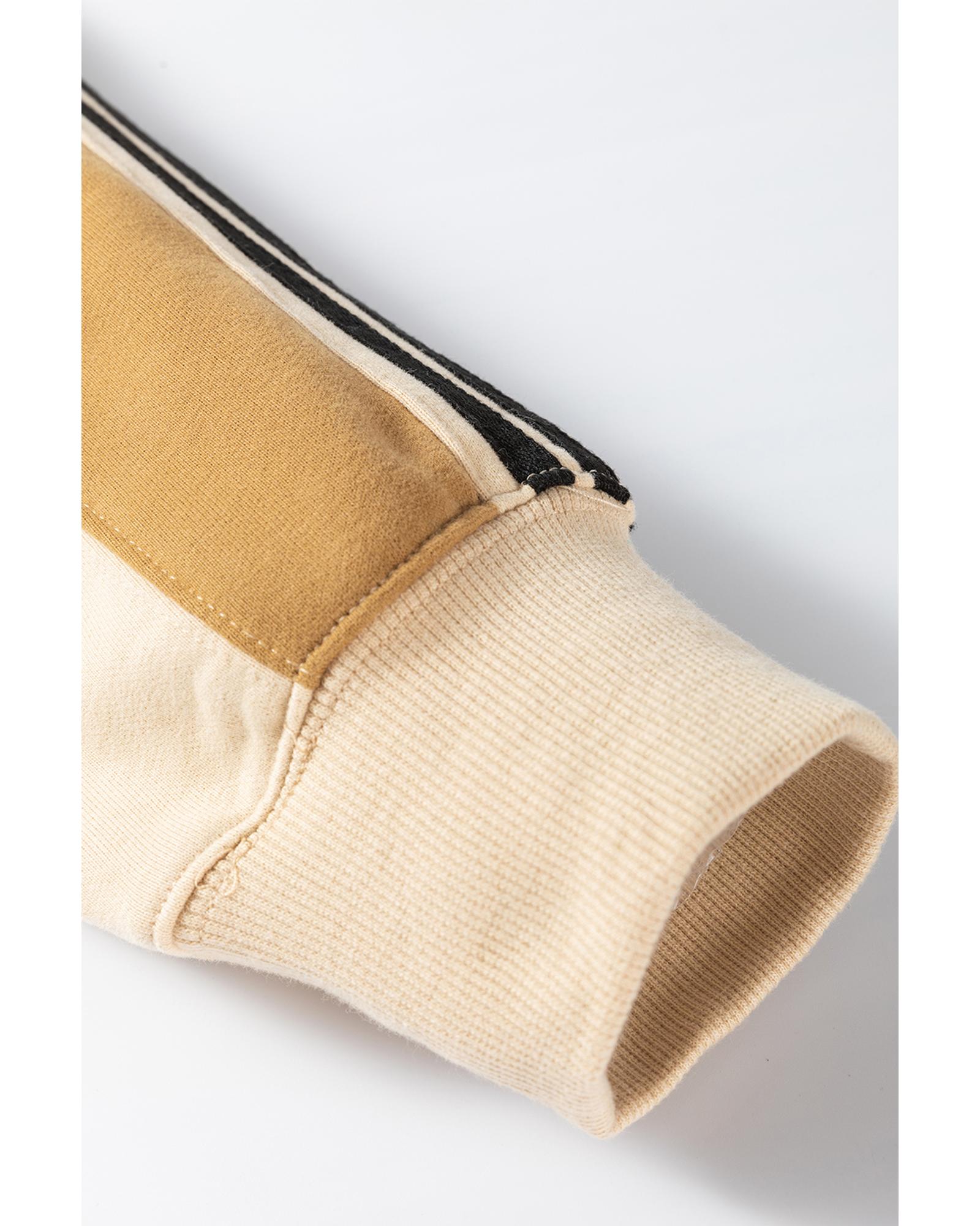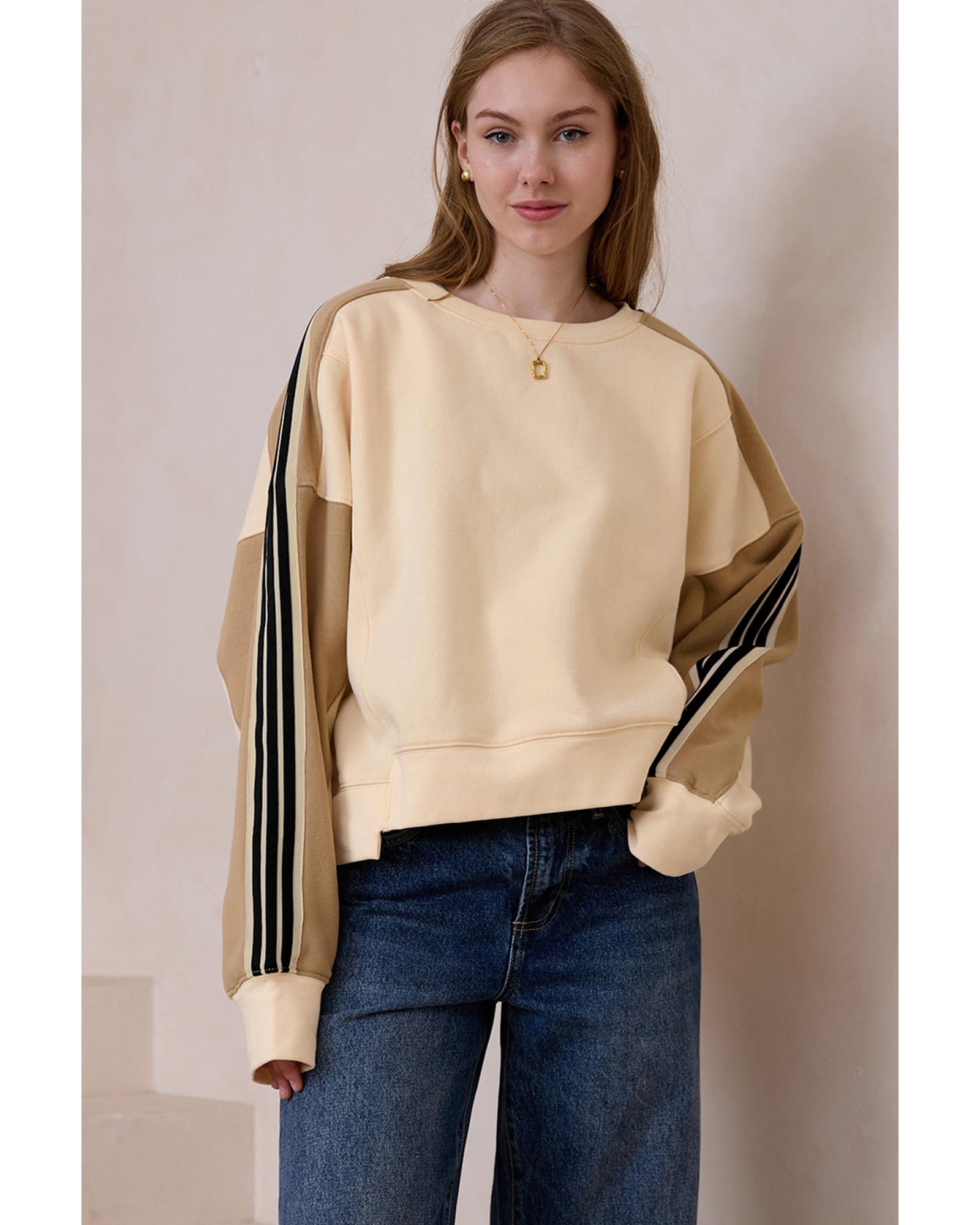 This beige contrast striped patchwork drop shoulder sweatshirt offers a relaxed and trendy look, perfect for casual wear. Its unique color block design with striped patchwork details on the sleeves adds a stylish touch to your outfit. Made from a comfortable cotton blend, it features ribbed details at the neckline, cuffs, and hemline for a snug fit.