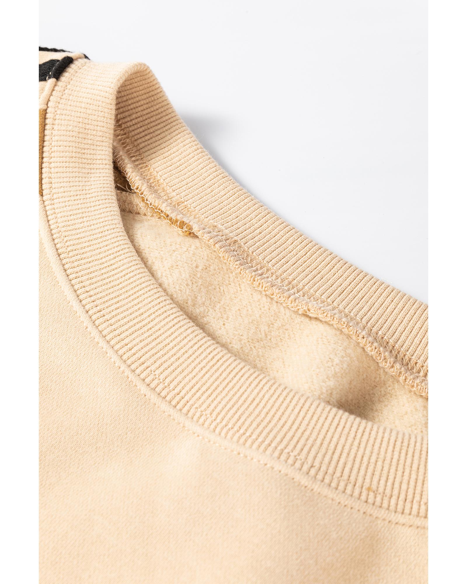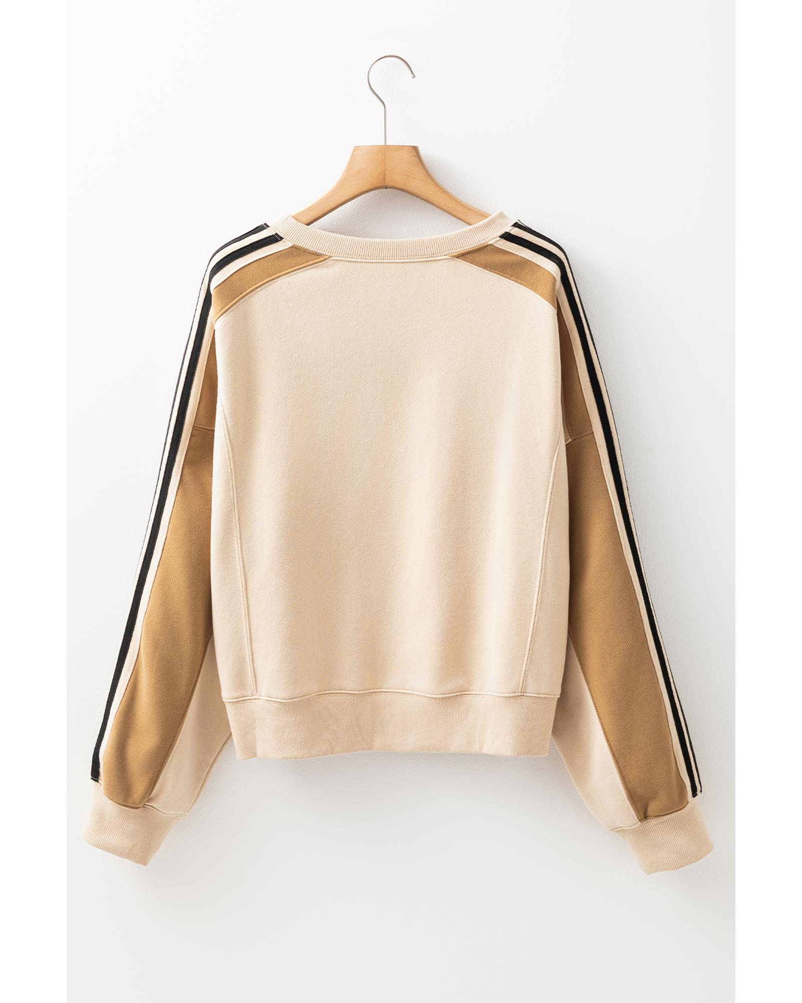 This beige contrast striped patchwork drop shoulder sweatshirt offers a relaxed and trendy look, perfect for casual wear. Its unique color block design with striped patchwork details on the sleeves adds a stylish touch to your outfit. Made from a comfortable cotton blend, it features ribbed details at the neckline, cuffs, and hemline for a snug fit.