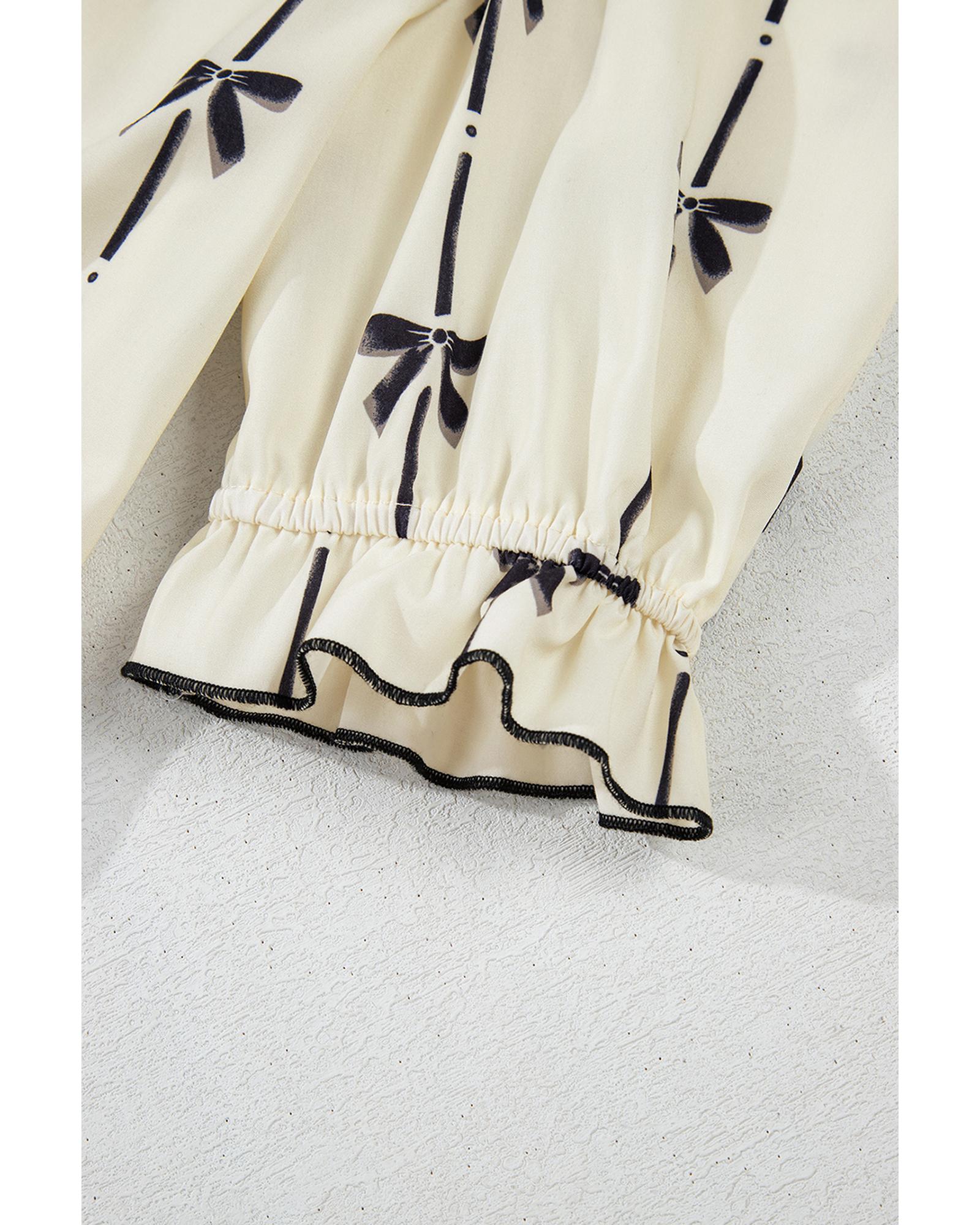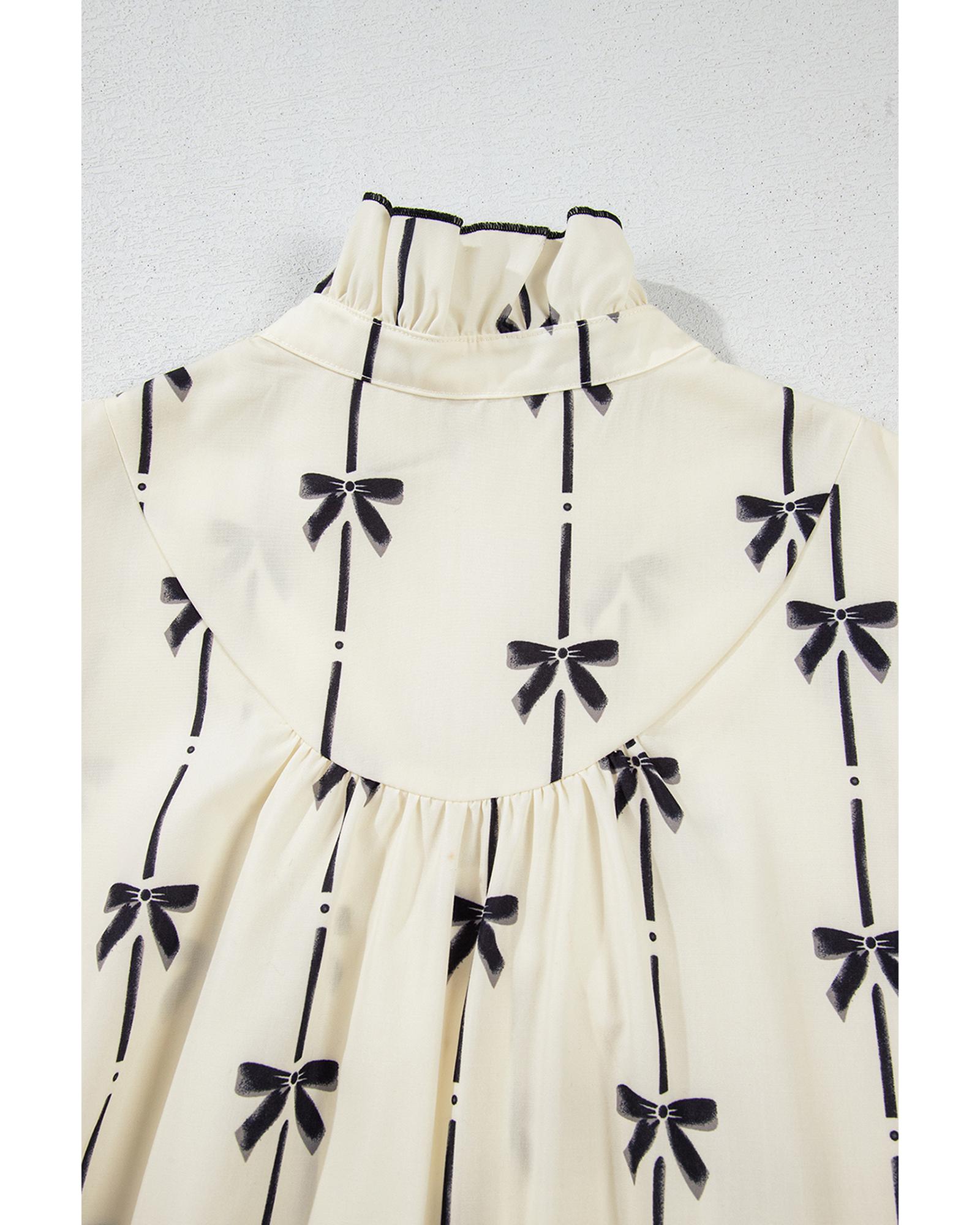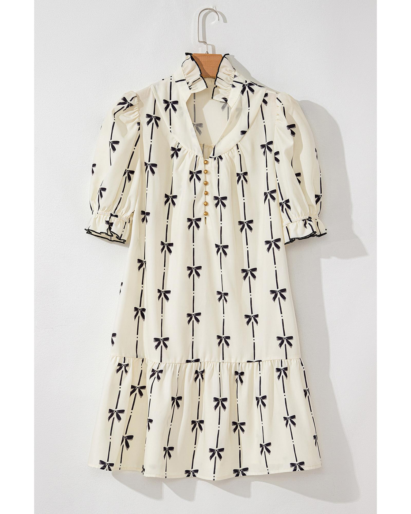 Beige Cute Bowknot Printed Bubble Sleeve V Neck Mini Dress – XL