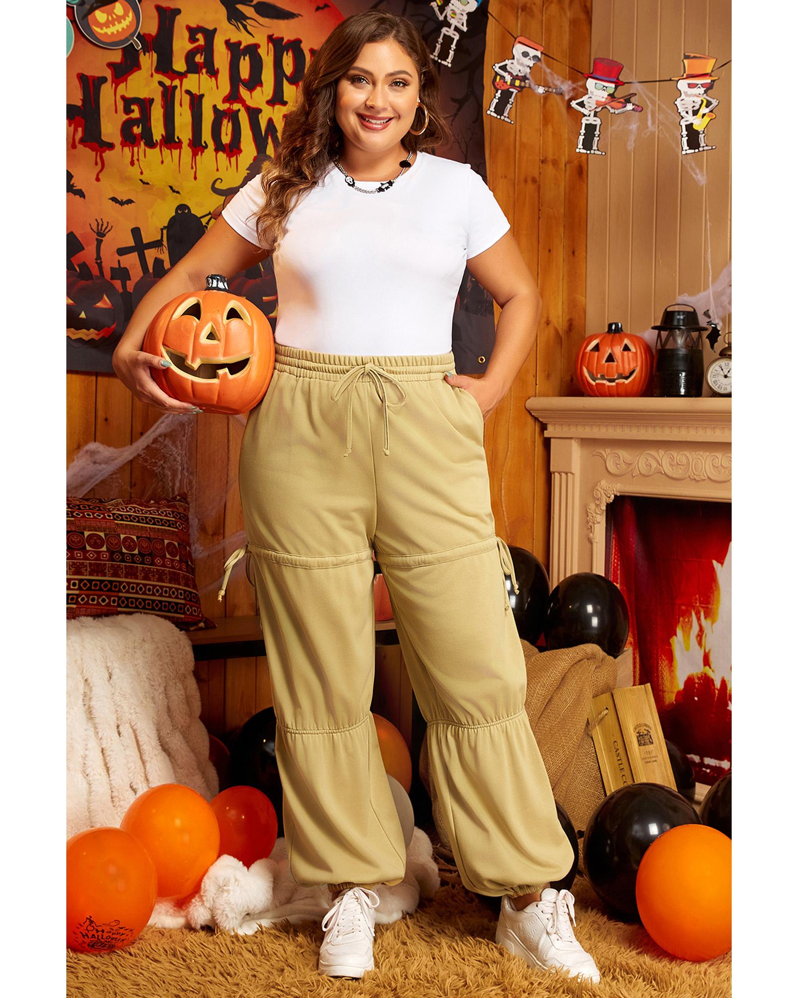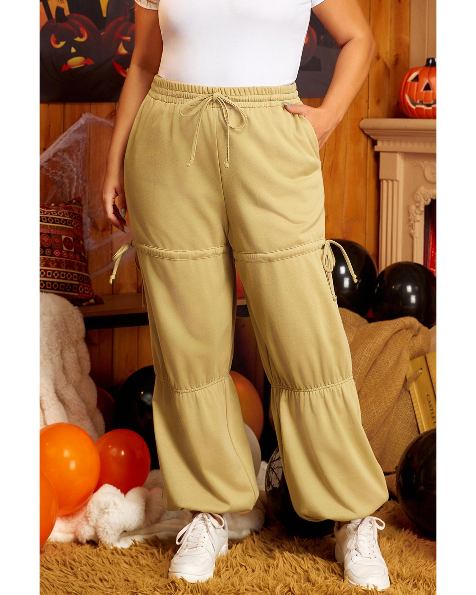 Beige Drawstring Adjusted Band High Waist Plus Size Pants – 3X