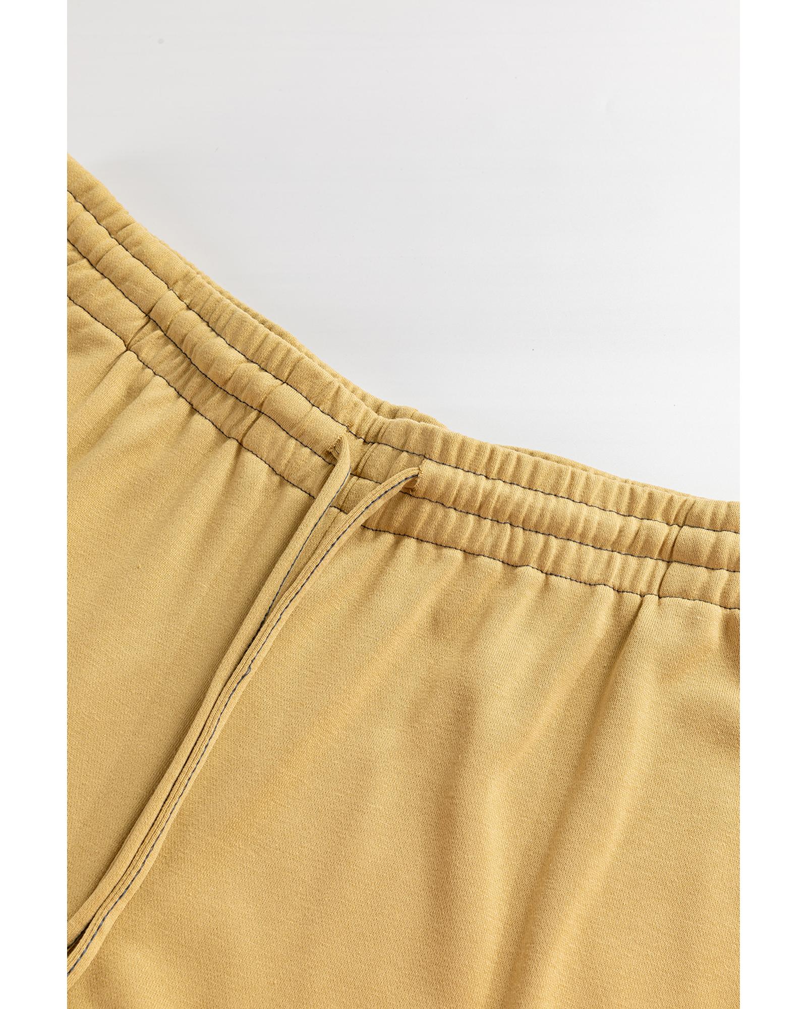 This pair of beige high waist pants features a stylish and comfortable design suitable for various occasions. The adjustable drawstring waistband allows for a customized fit, while the loose fit and tiered elastic detailing provide added comfort and a trendy look. Made from a blend of polyester and cotton, these pants combine durability with softness, making them a versatile addition to your wardrobe.