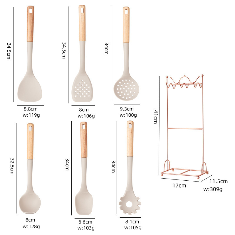 Beige Elegant 7-Piece Silicone Kitchen Utensil Set with Wooden Handles & Rose Gold Stand – Non-Stick Cookware Safe