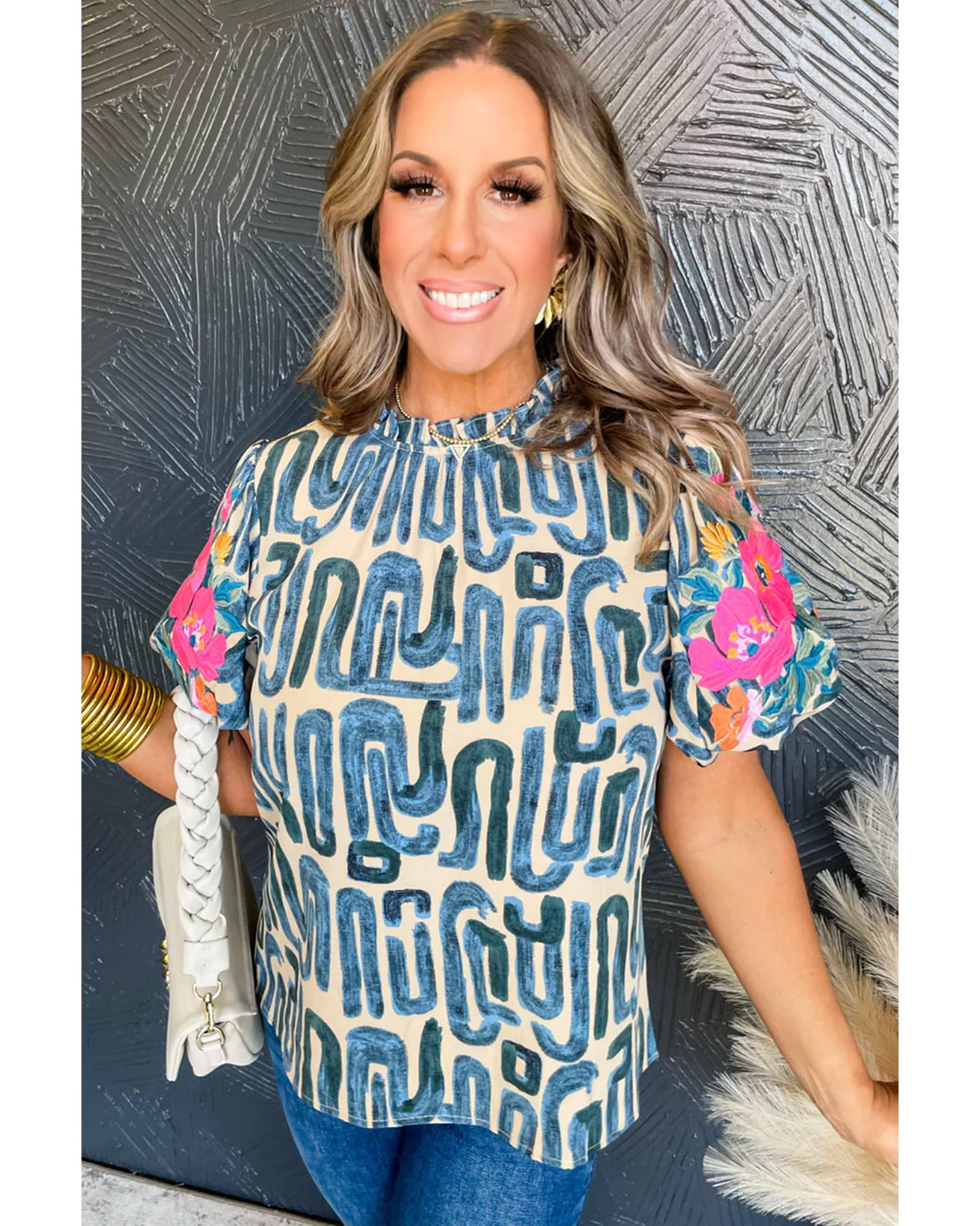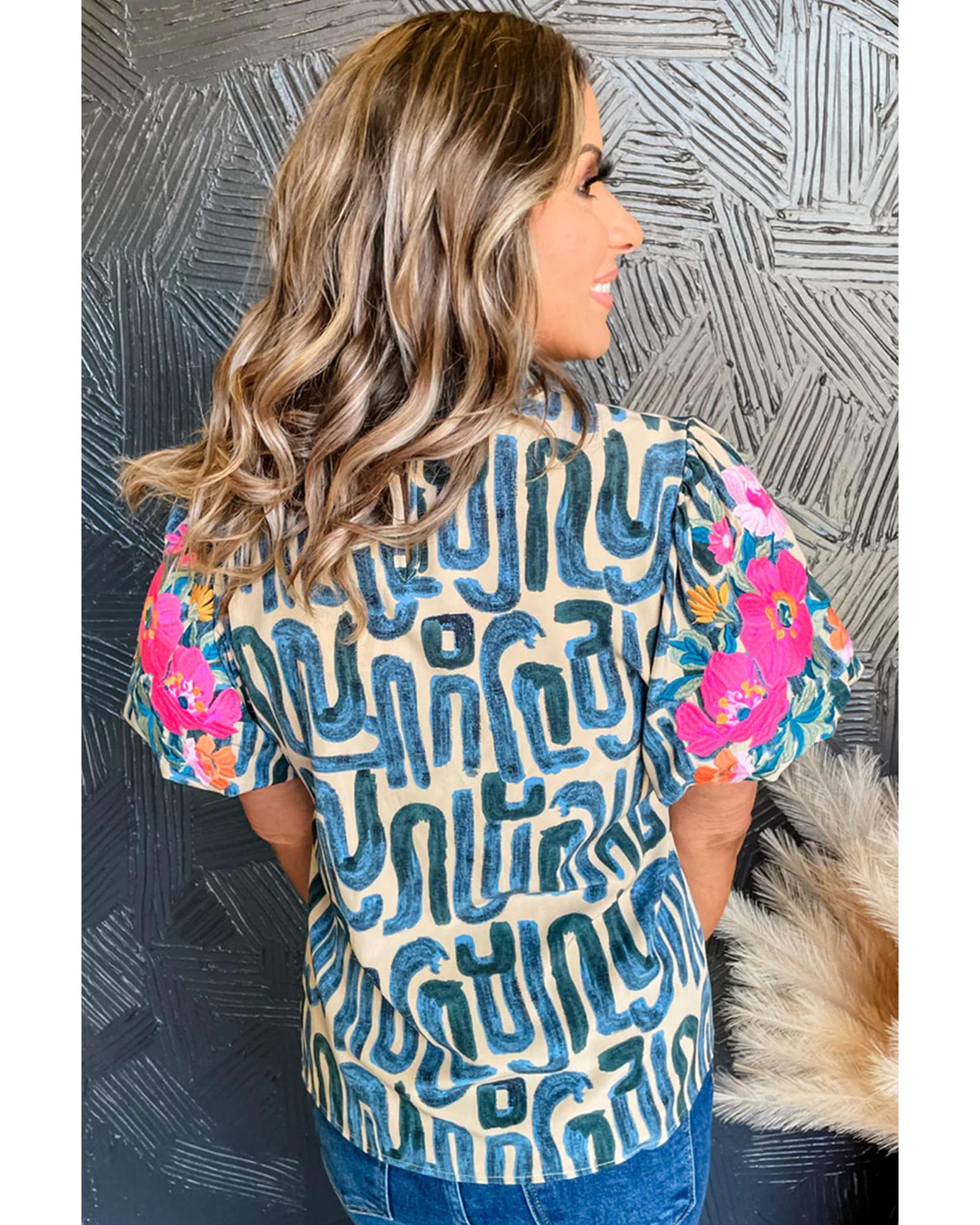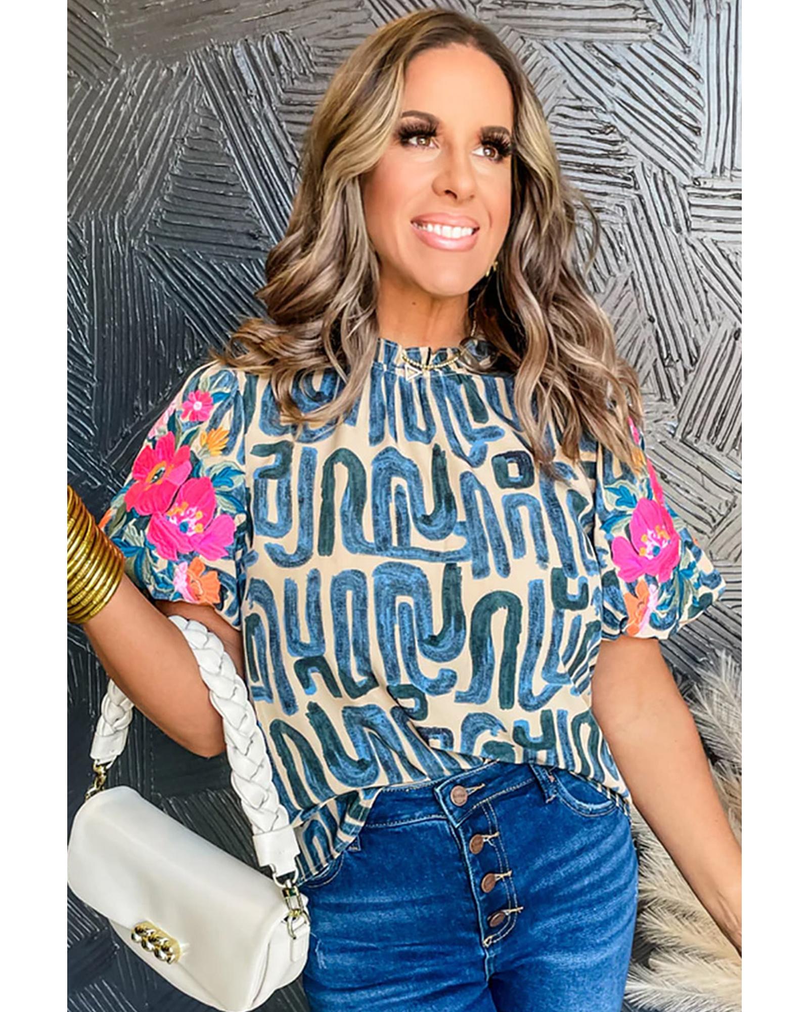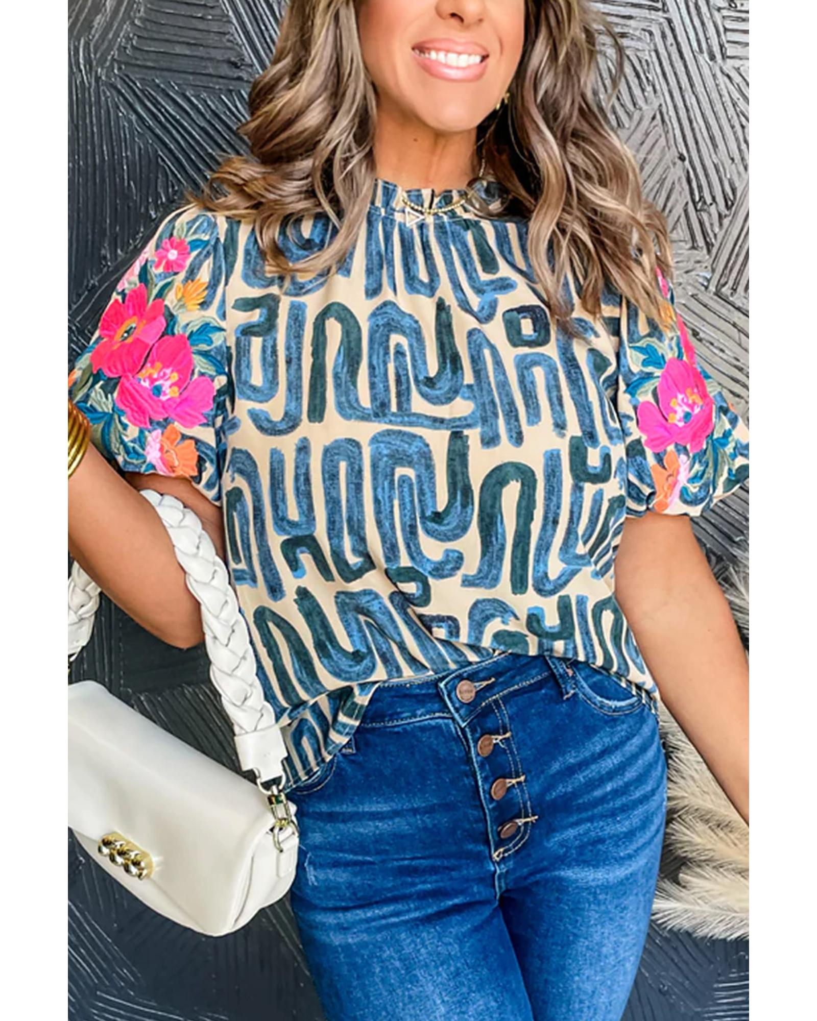 This beige embroidered puff sleeve top features a romantic and vintage-inspired design, perfect for adding a feminine touch to your wardrobe. The top showcases an eye-catching abstract pattern and elegant details, making it suitable for various occasions.