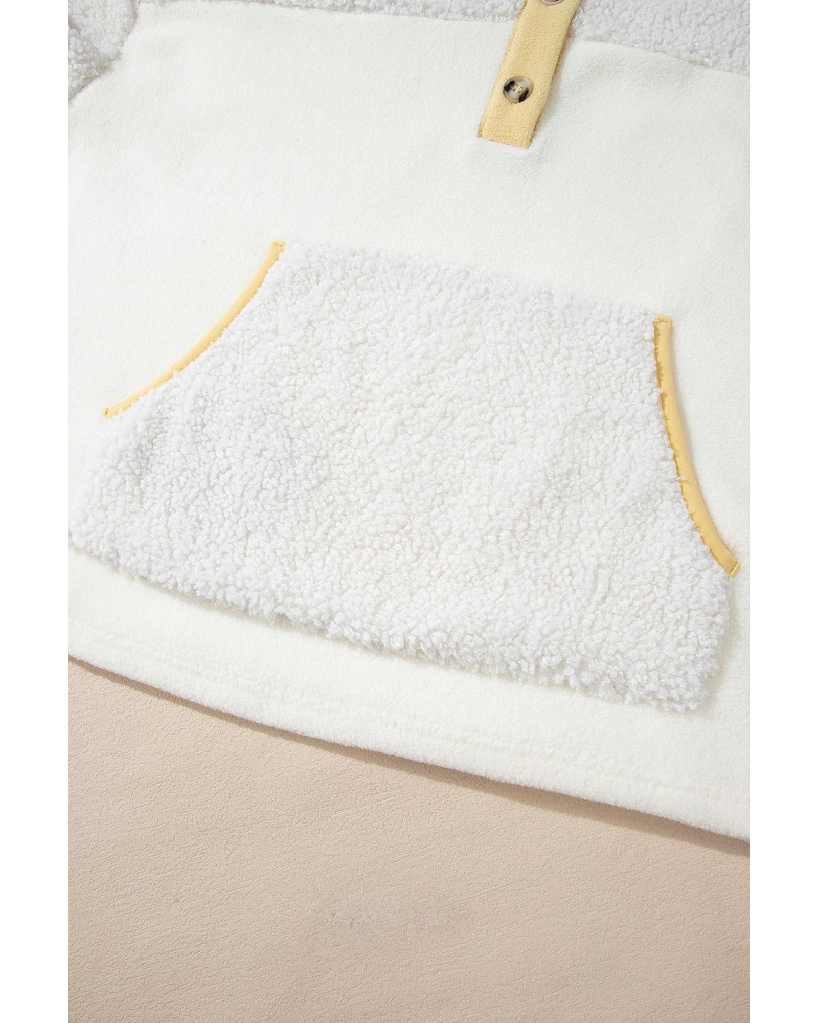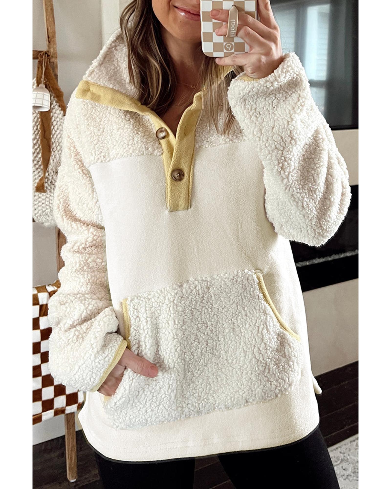Beige Fleece Colorblock Trim Buttons Collar Sweatshirt with Pocket – M