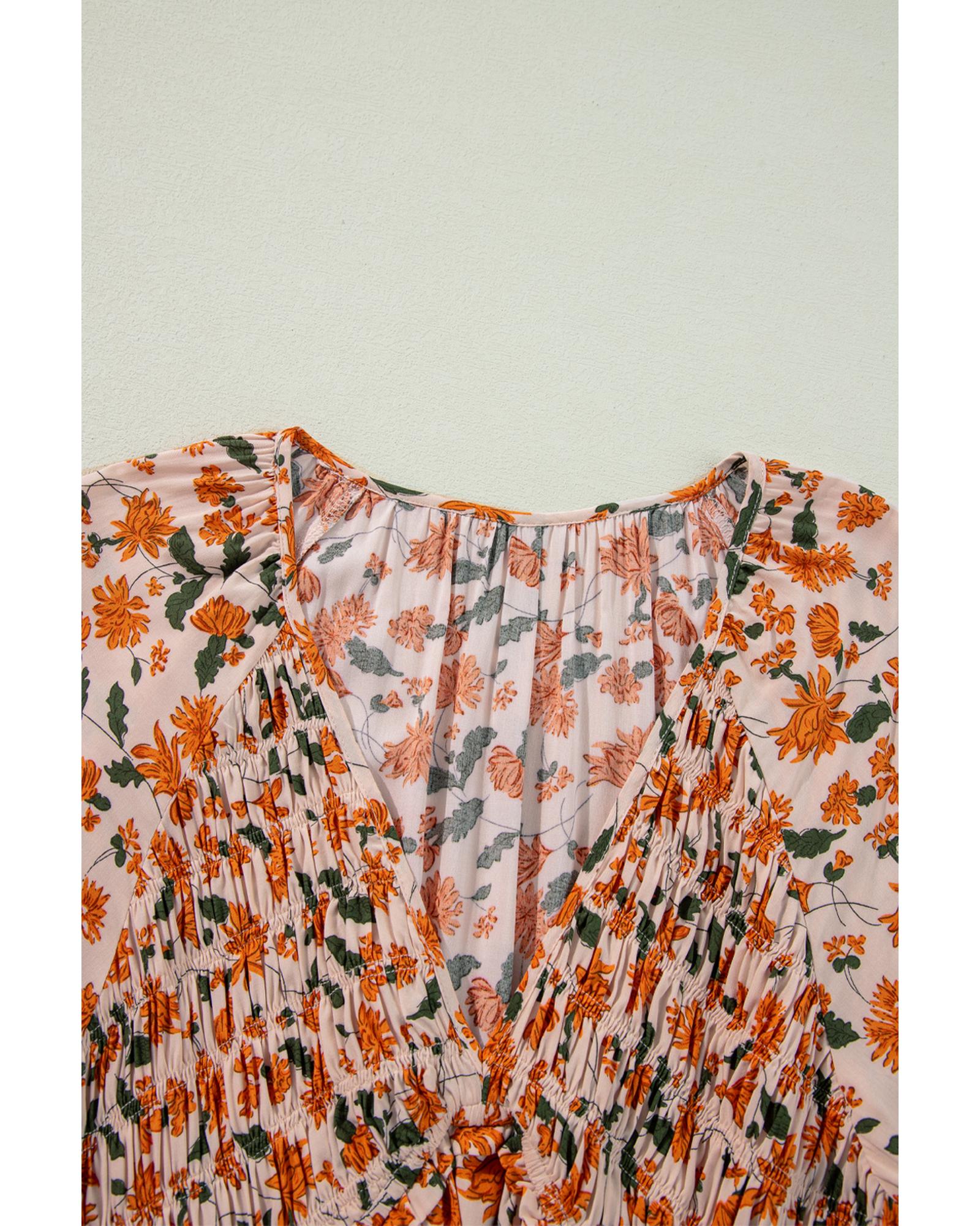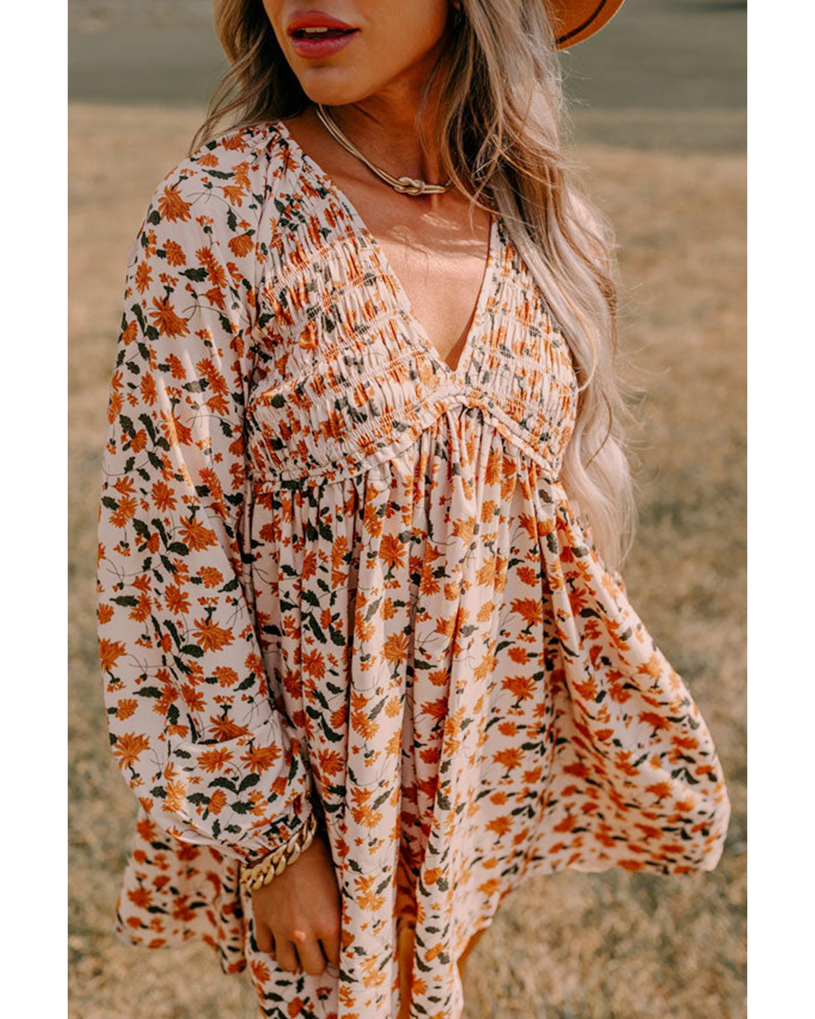 Beige Floral Deep V Neck Smocked Bust Bubble Sleeve Babydoll Dress - S