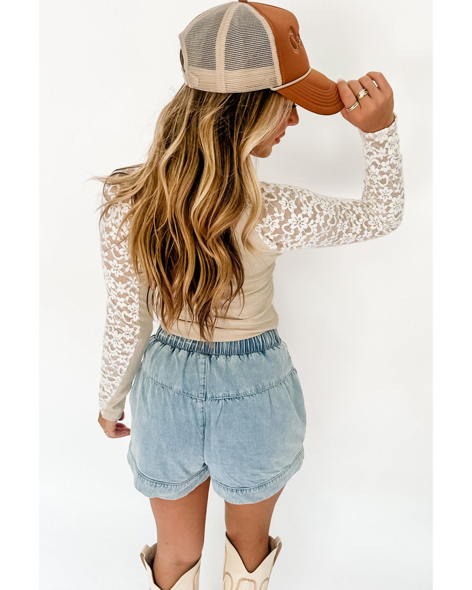 This beige floral lace patchwork long sleeve top features a high neck design and a slim fit silhouette, offering a stylish and comfortable look. Made from a soft, elastic fabric, it is suitable for various occasions and pairs well with different bottoms such as pants, skirts, and jeans.
