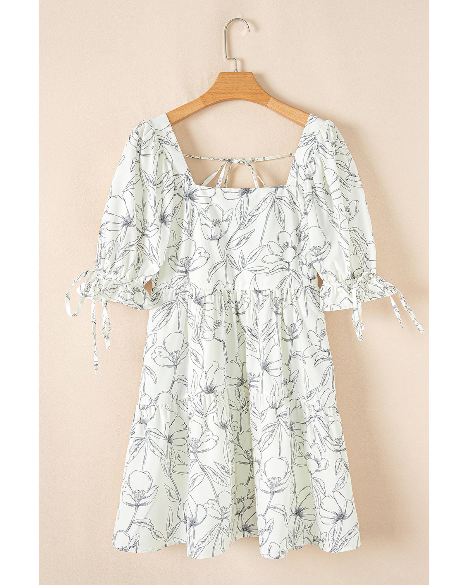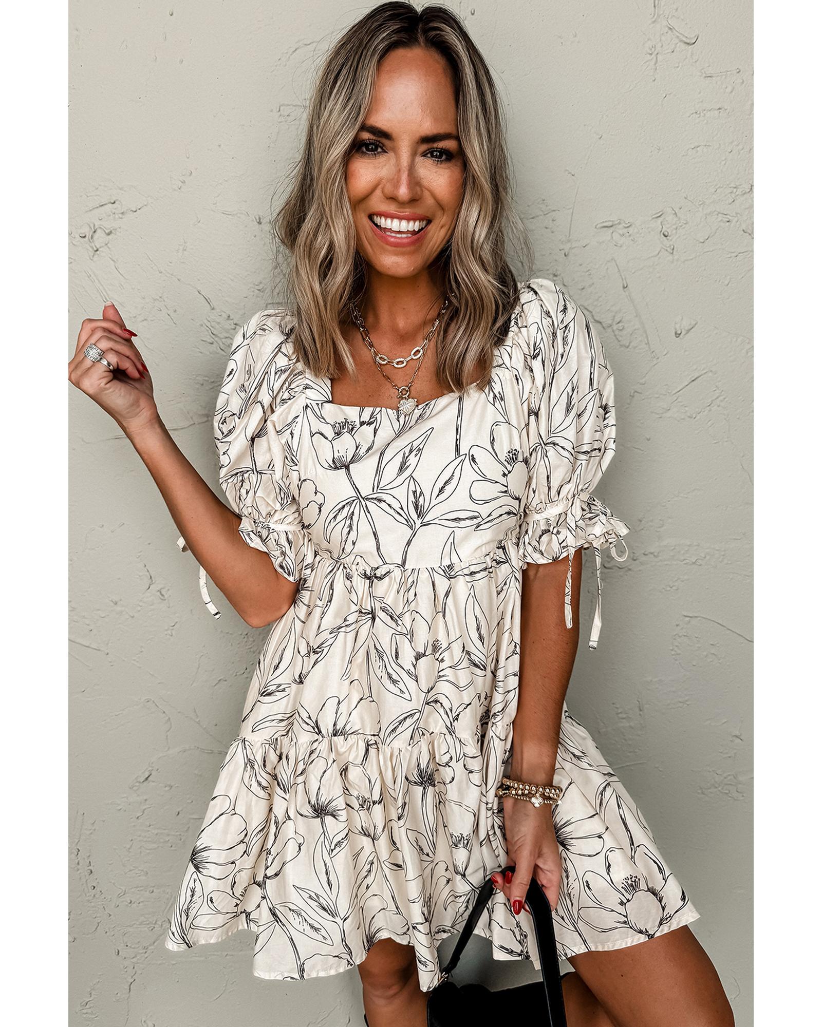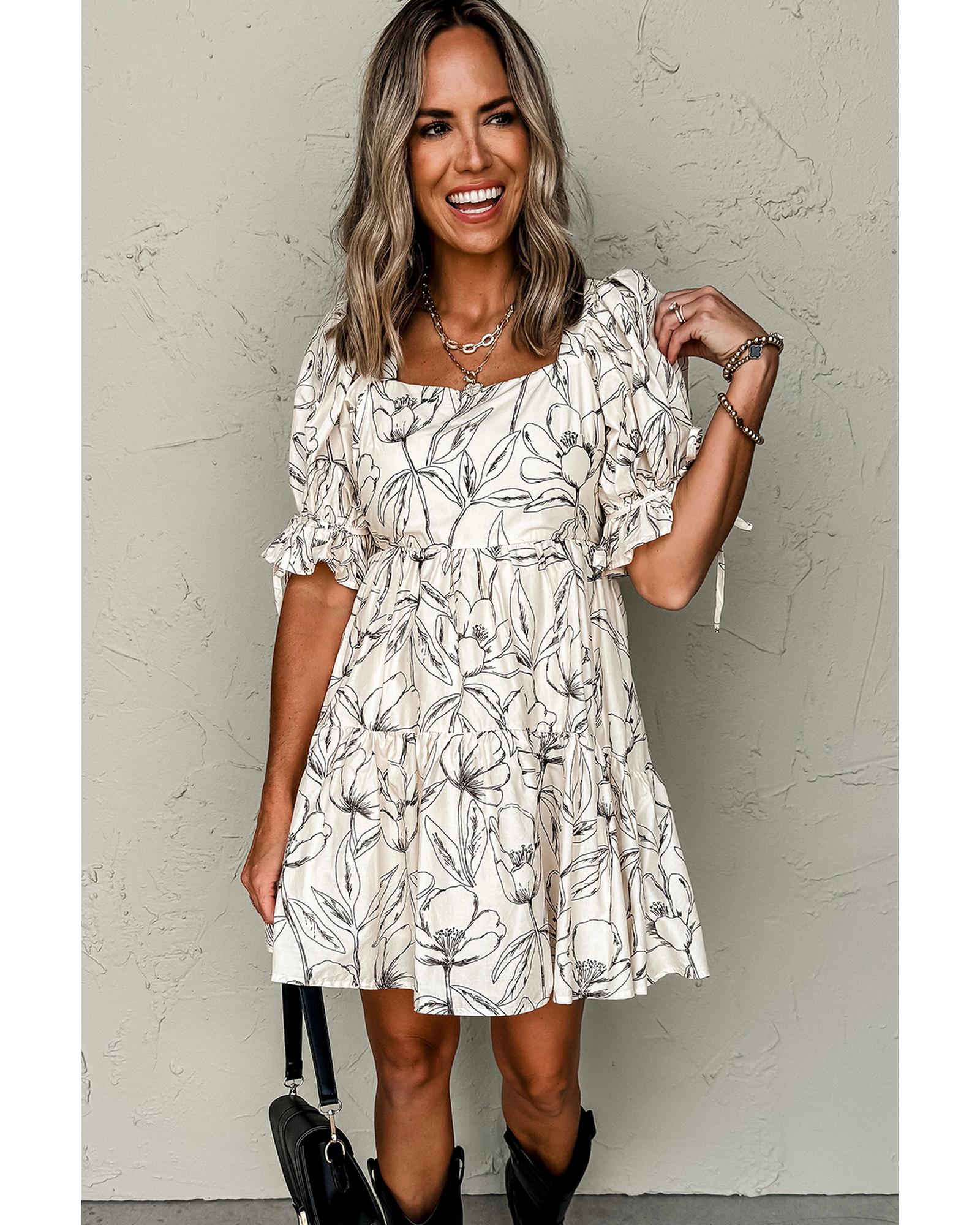 This beige floral print mini dress features a stylish square neckline and puff sleeves, offering a comfortable and flattering fit. The shirred back detail adds a touch of elegance, making it suitable for various occasions. The flowy design ensures ease of movement and a chic appearance.