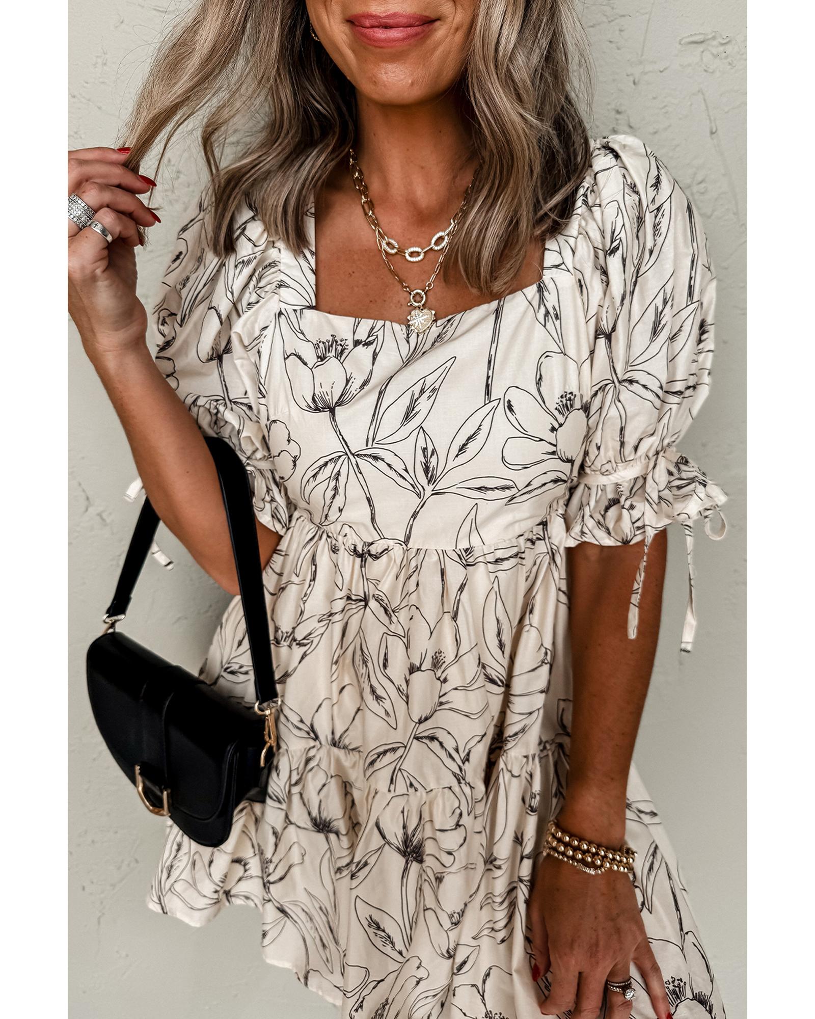 This beige floral print mini dress features a stylish square neckline and puff sleeves, offering a charming and feminine look. The shirred back detail adds a touch of elegance while ensuring a comfortable fit. Perfect for warm weather, this flowy dress combines fashion and comfort effortlessly.