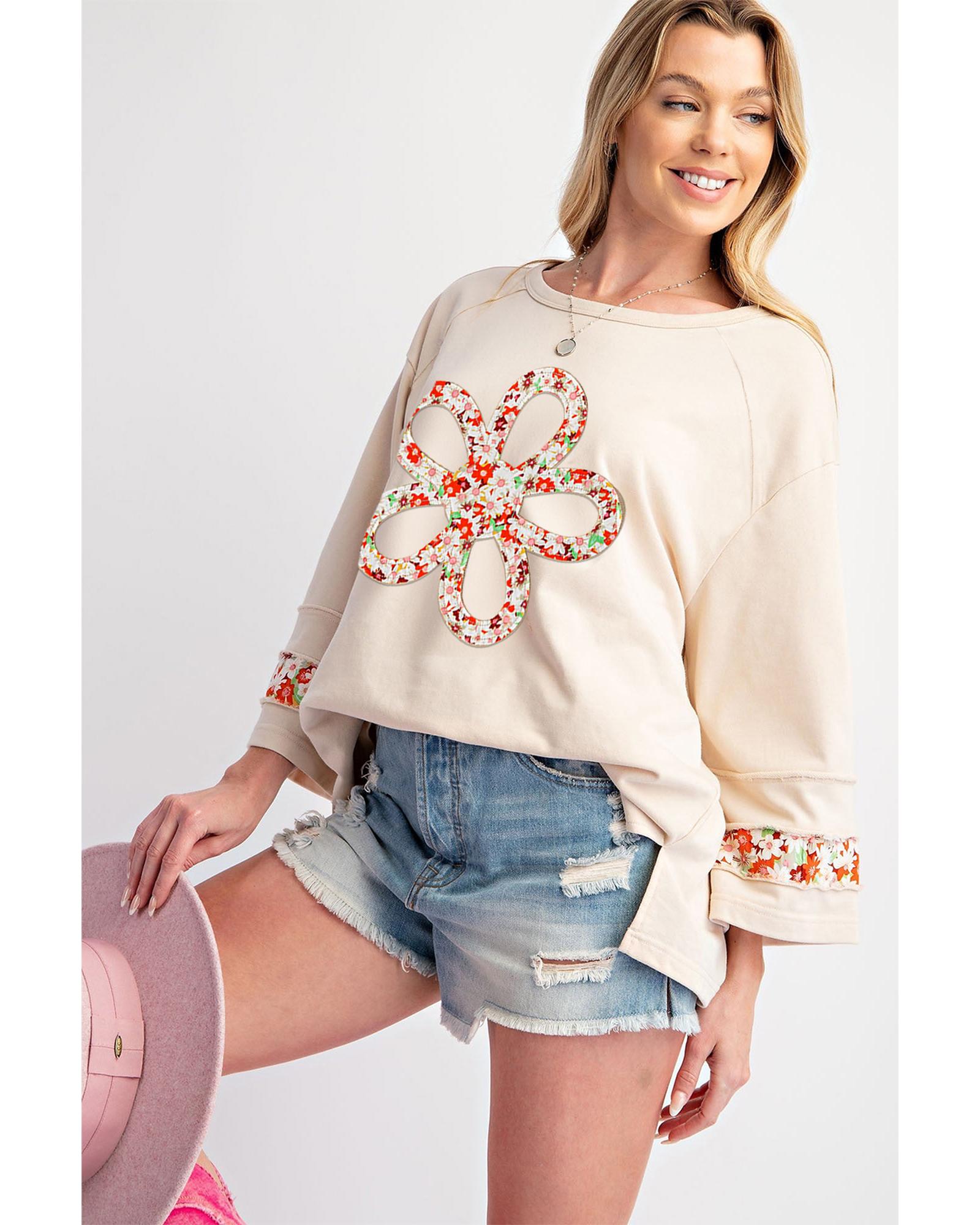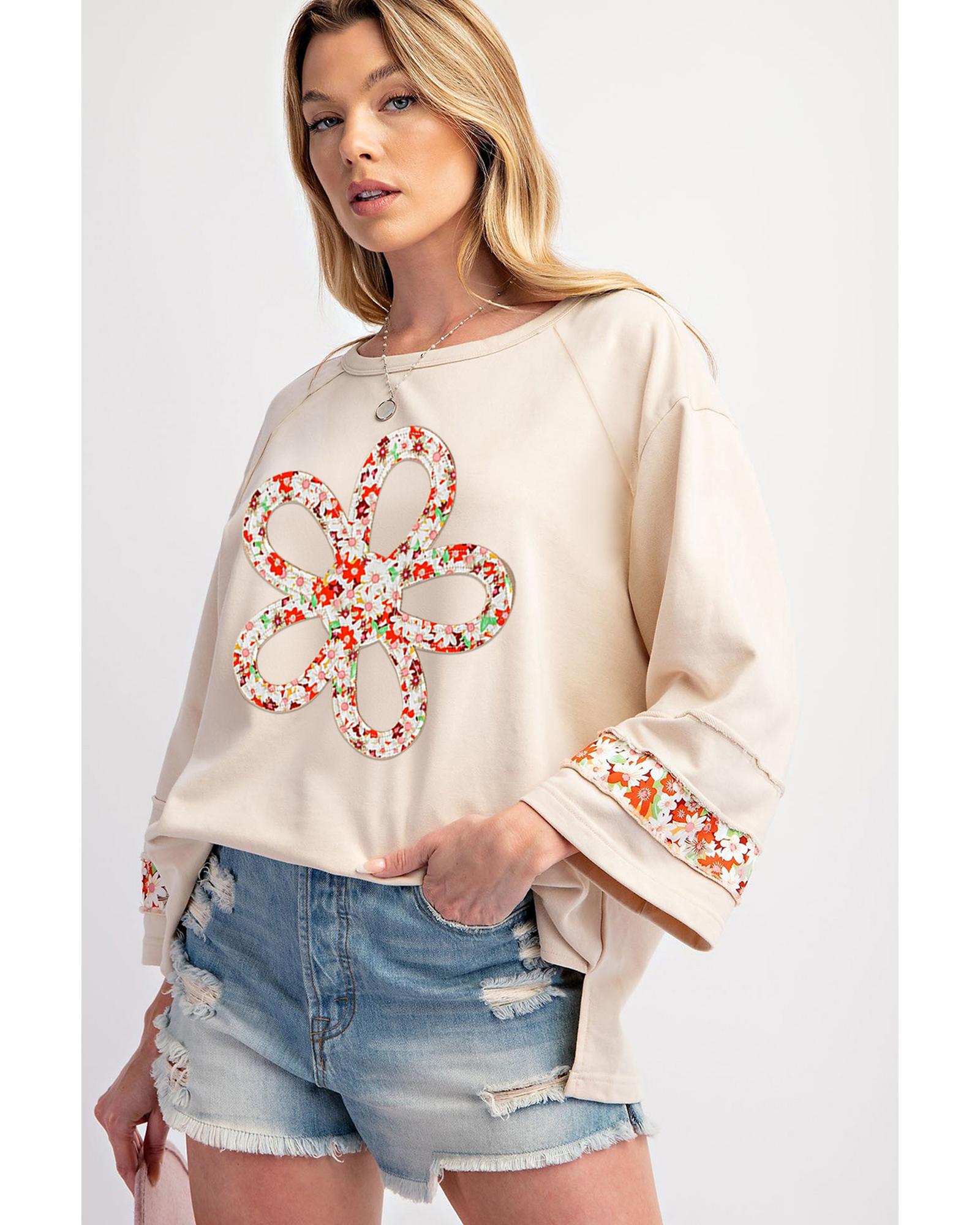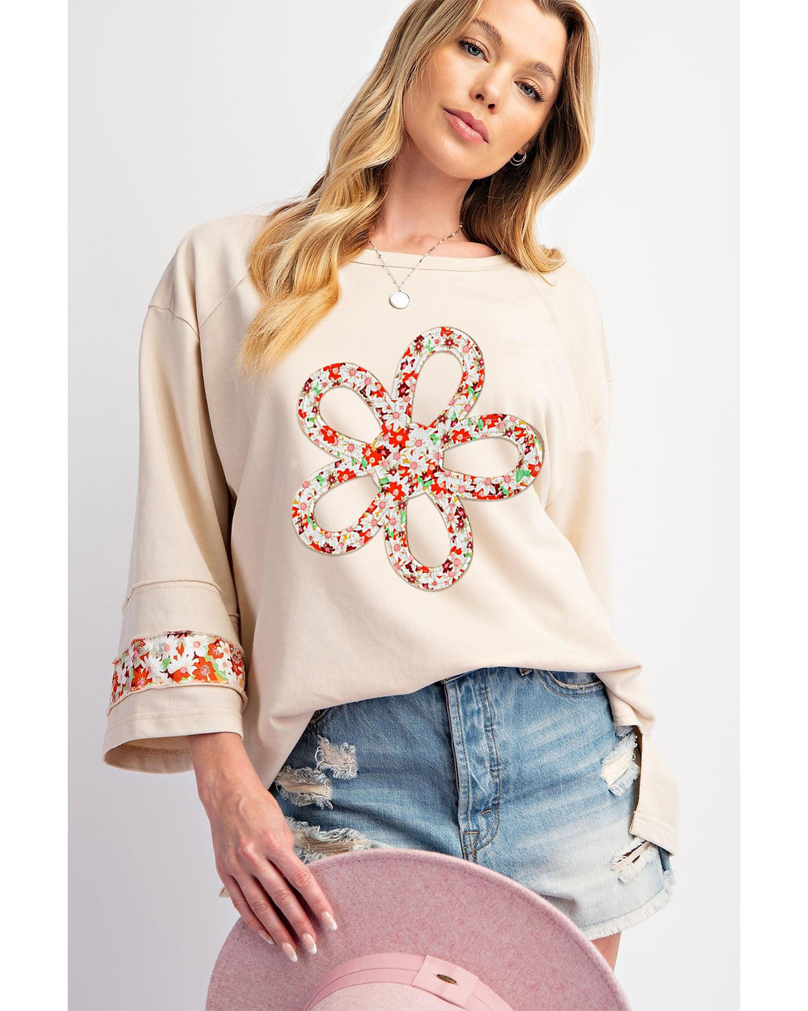 Beige Flower Patch Graphic Exposed Seam Wide Sleeve Top – L