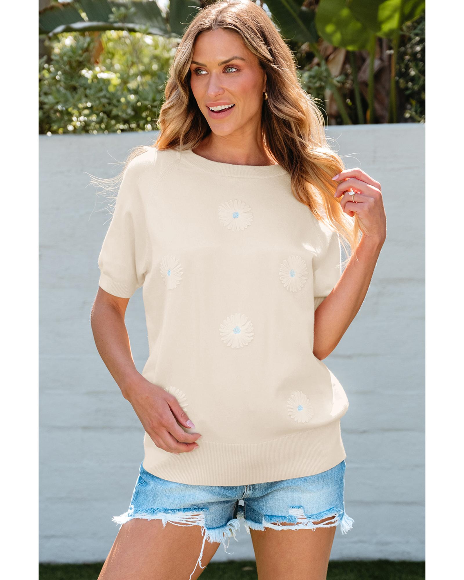 - Stylish beige flower pattern short sleeve knitted top