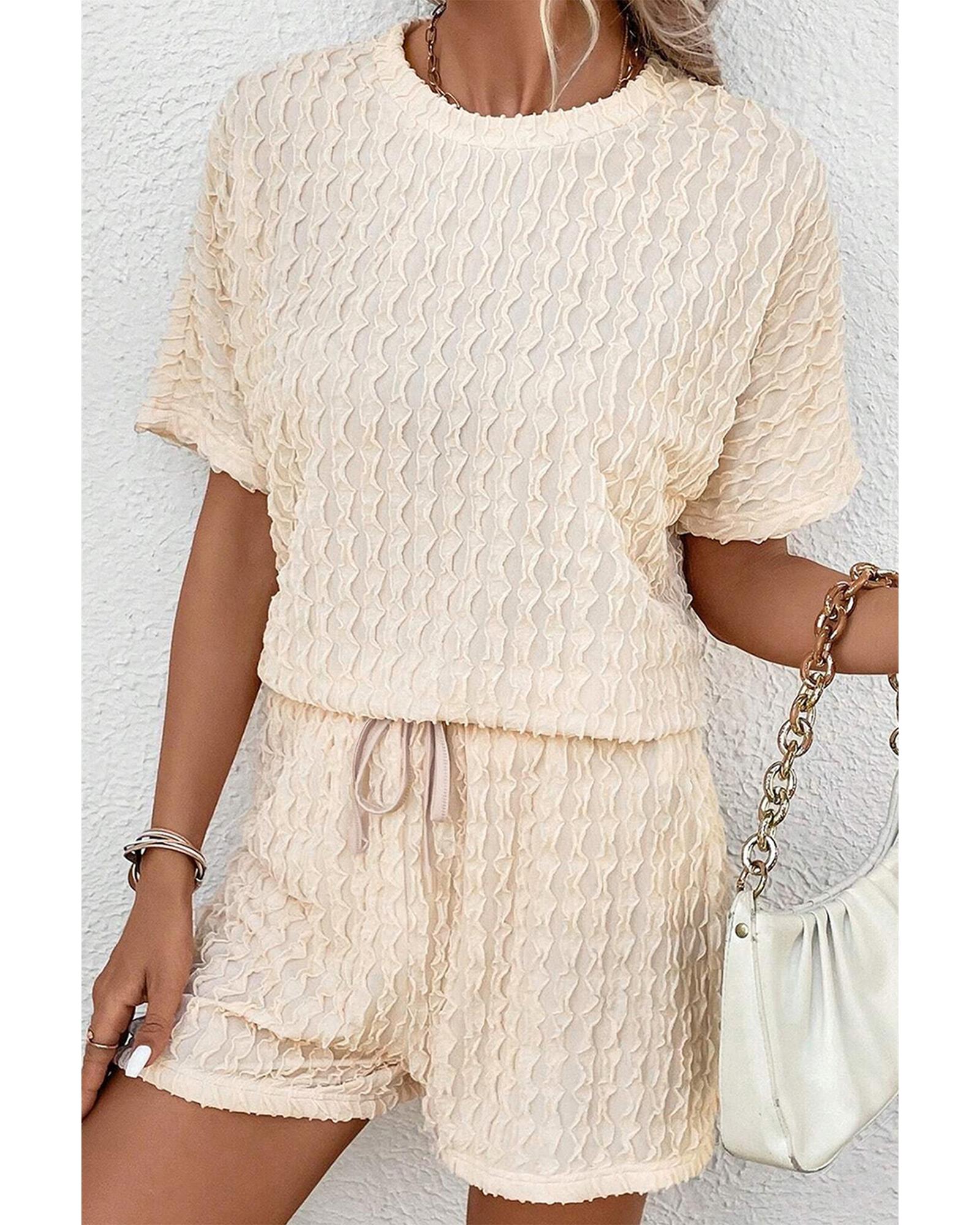 This beige frill textured short sleeve top and drawstring shorts set offers a stylish and coordinated outfit option. Designed with a trendy fitted look, it combines playful details with comfort, making it suitable for various casual occasions.