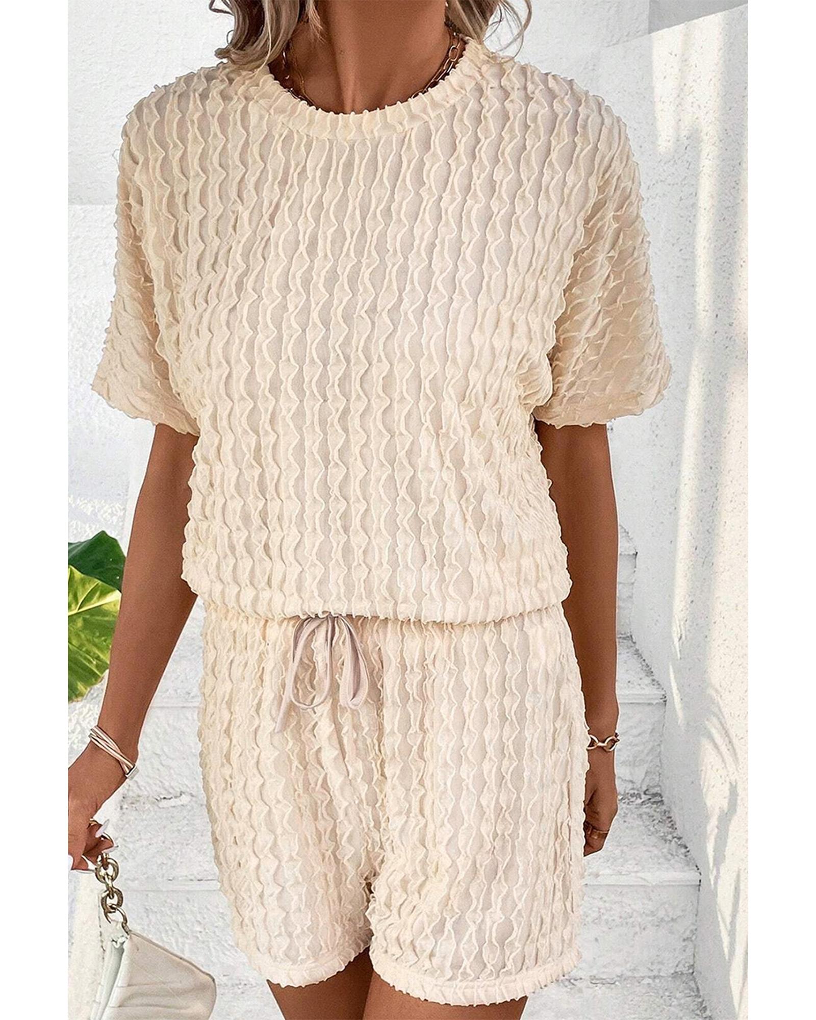 Beige Frill Textured Short Sleeve Top and Drawstring Shorts Set - S