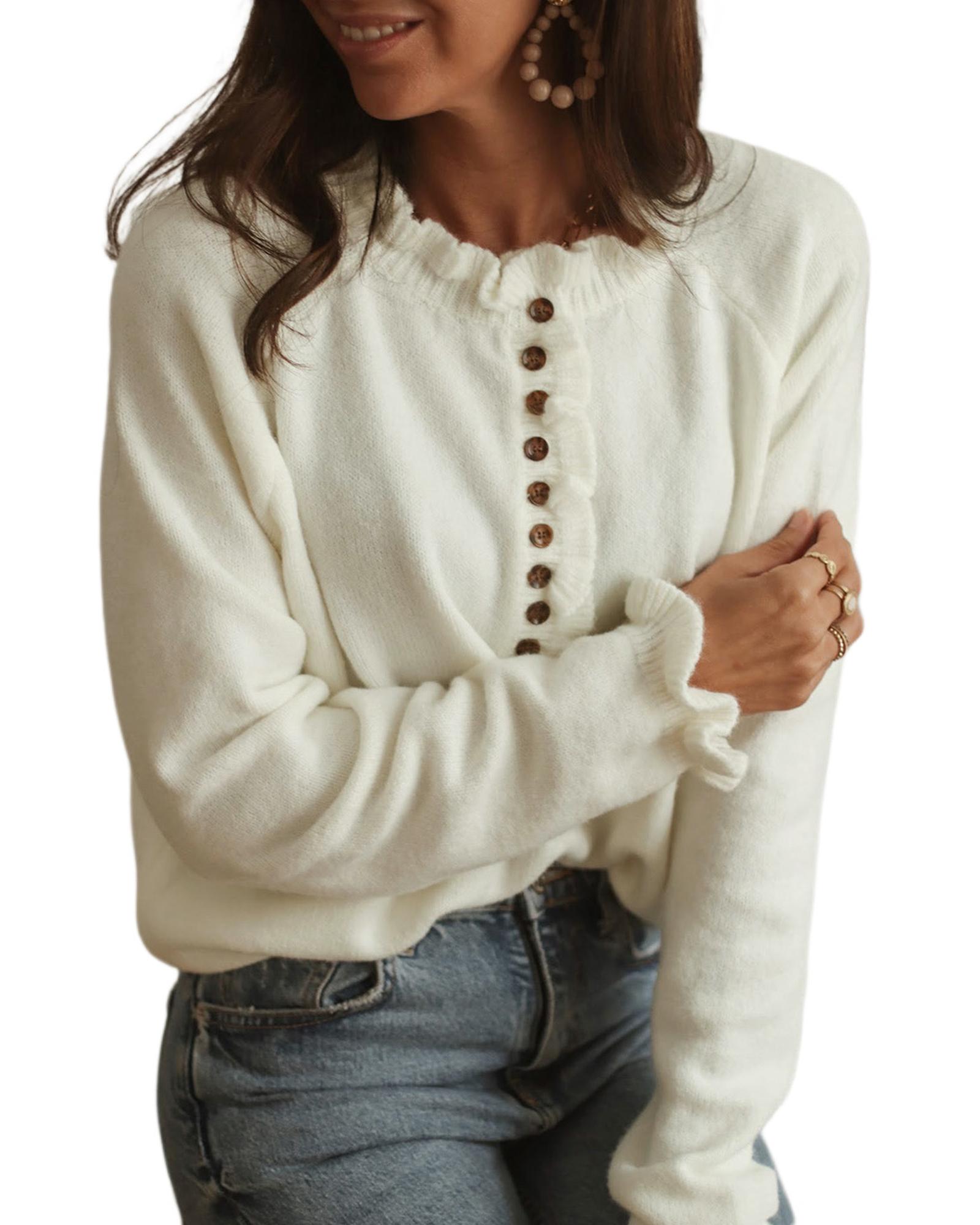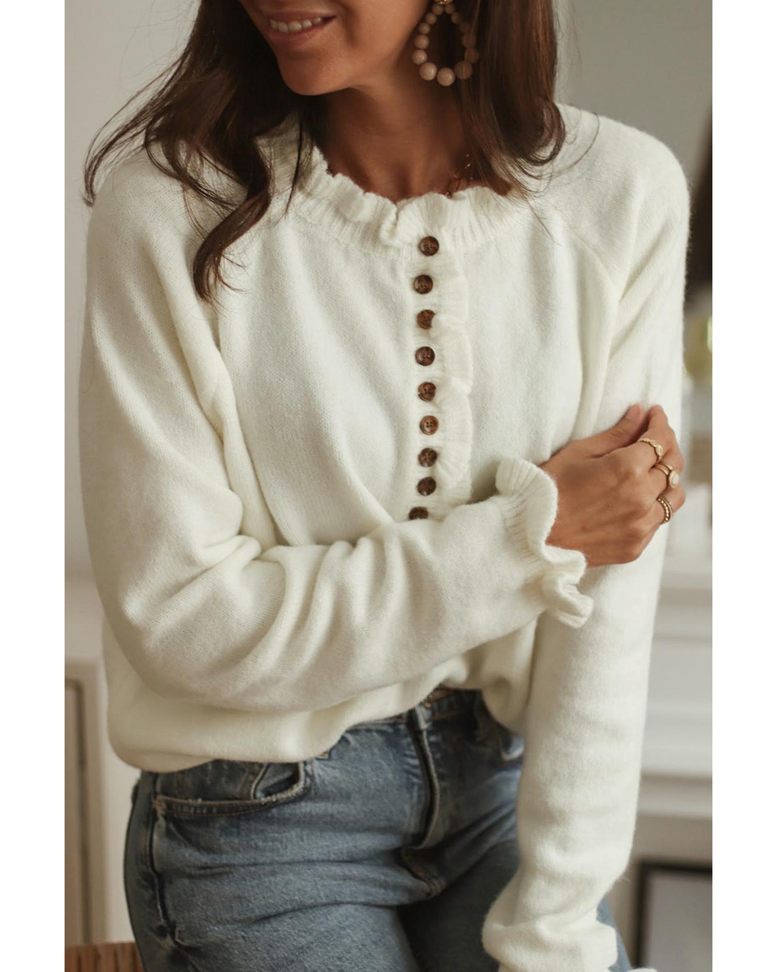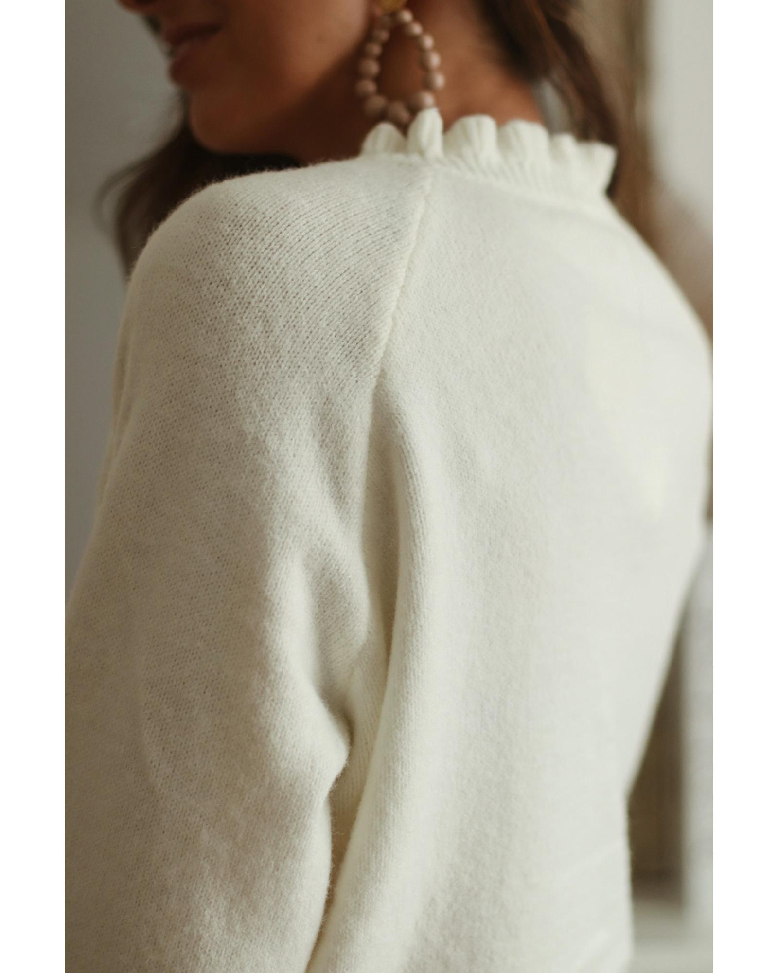 This beige knit pullover sweater features a stylish frill trim and button details, offering a trendy and elegant look. Made from soft, lightweight, and warm material, it provides comfort and versatility for daily winter wear. The pullover style makes it easy to put on and take off, making it a practical addition to your wardrobe.