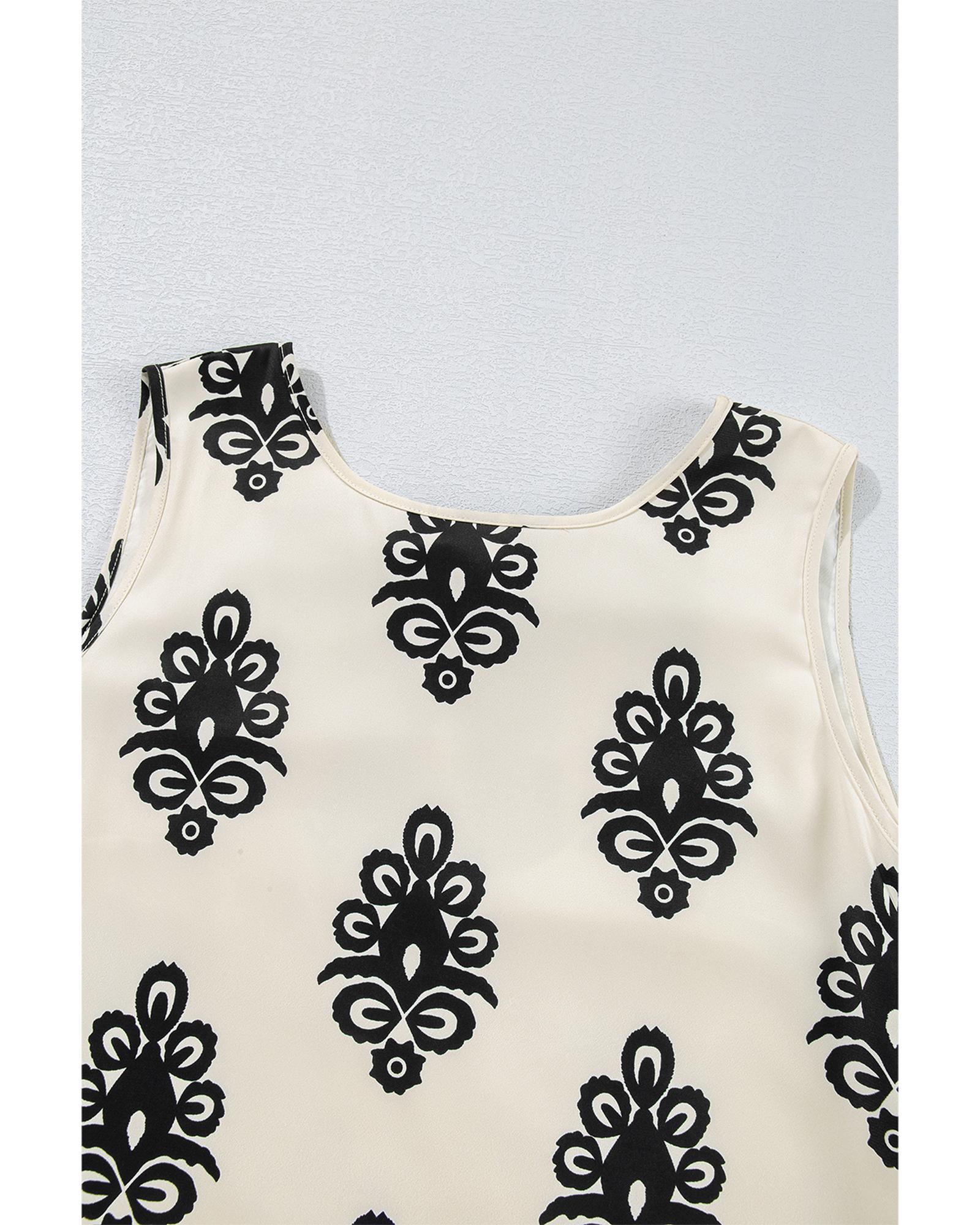 This beige mini dress features a modern geometric print and a sleeveless design, offering a stylish and comfortable fit. The hollowed bowknot detail at the back adds an elegant touch, making it suitable for various occasions. The dress is crafted from lightweight polyester, ensuring ease of wear and a flattering silhouette.