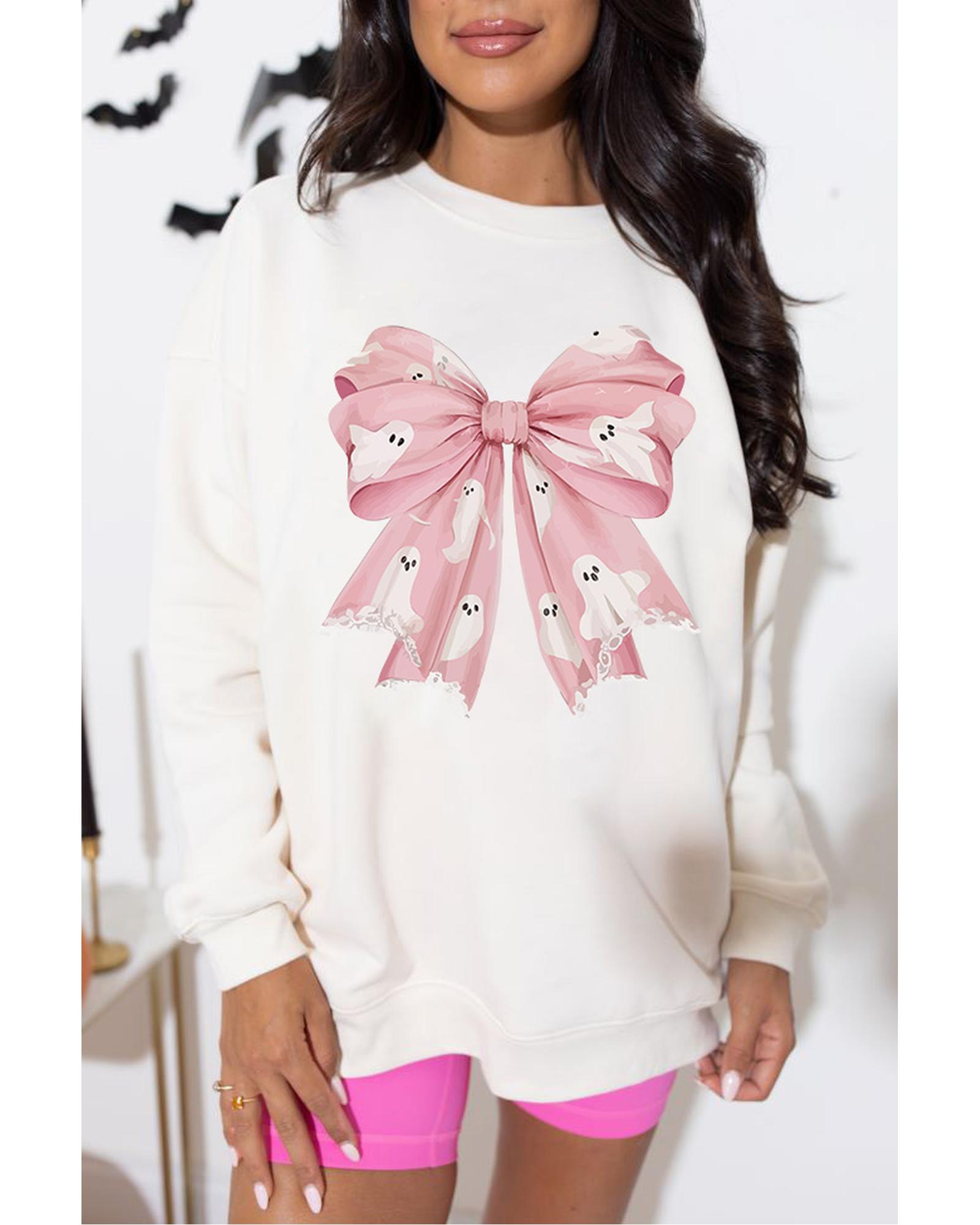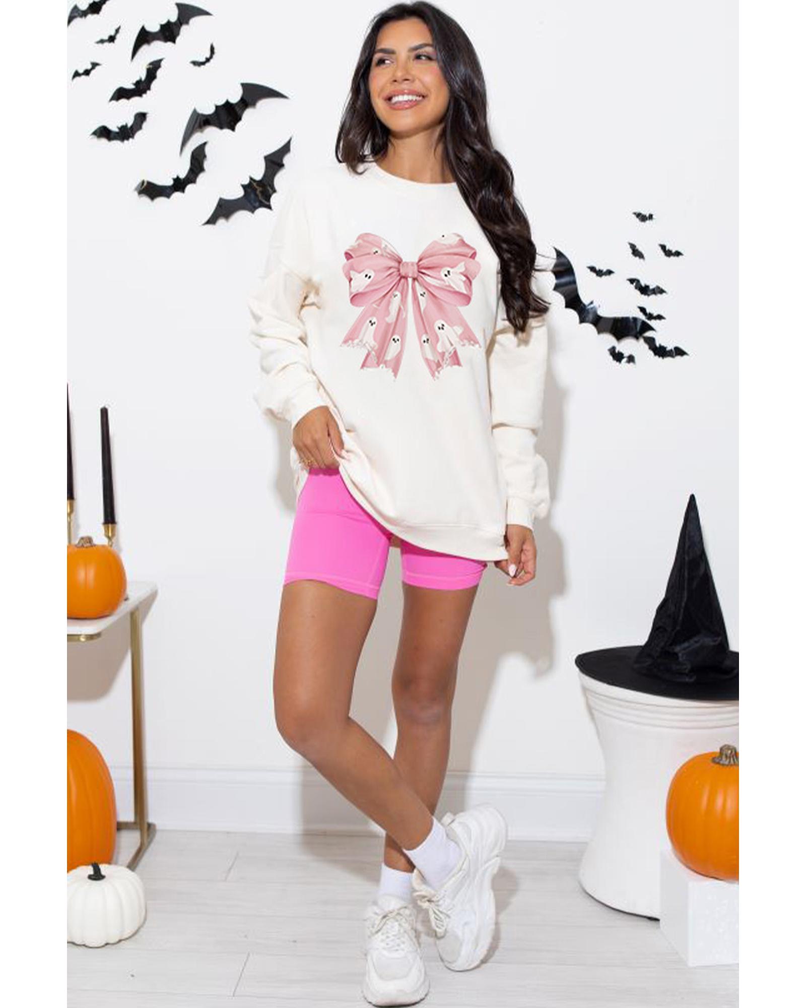 This sweatshirt features a trendy fitted design with a bold bowknot graphic and ghost illustrations, making it a stylish choice for the Halloween season. Its relaxed fit and drop shoulder design provide comfort and a casual look, perfect for pairing with dark jeans or leggings.