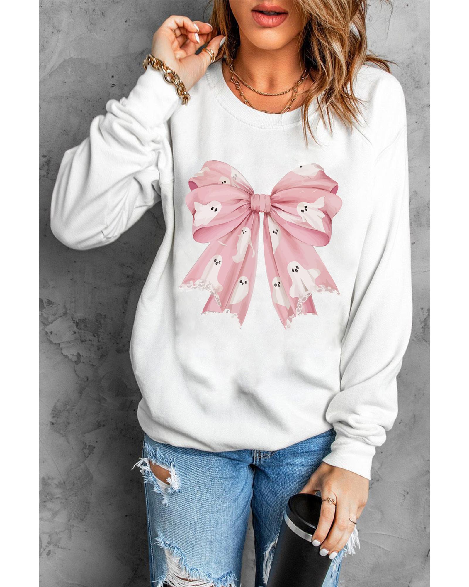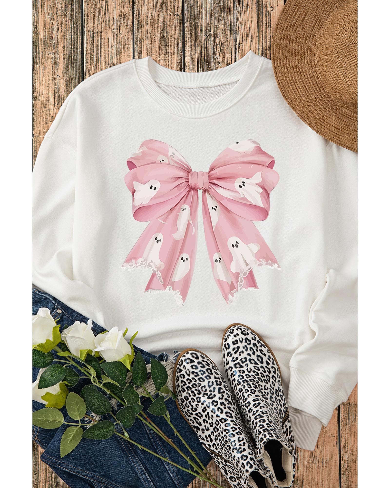 This sweatshirt features a trendy fitted design with a bold bowknot graphic and ghost illustrations, making it a stylish choice for the Halloween season. It offers a relaxed fit with drop shoulders and a classic crew neck, suitable for pairing with dark jeans or leggings.