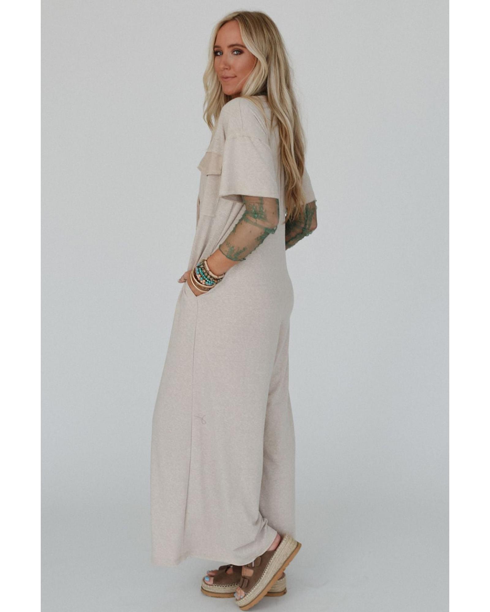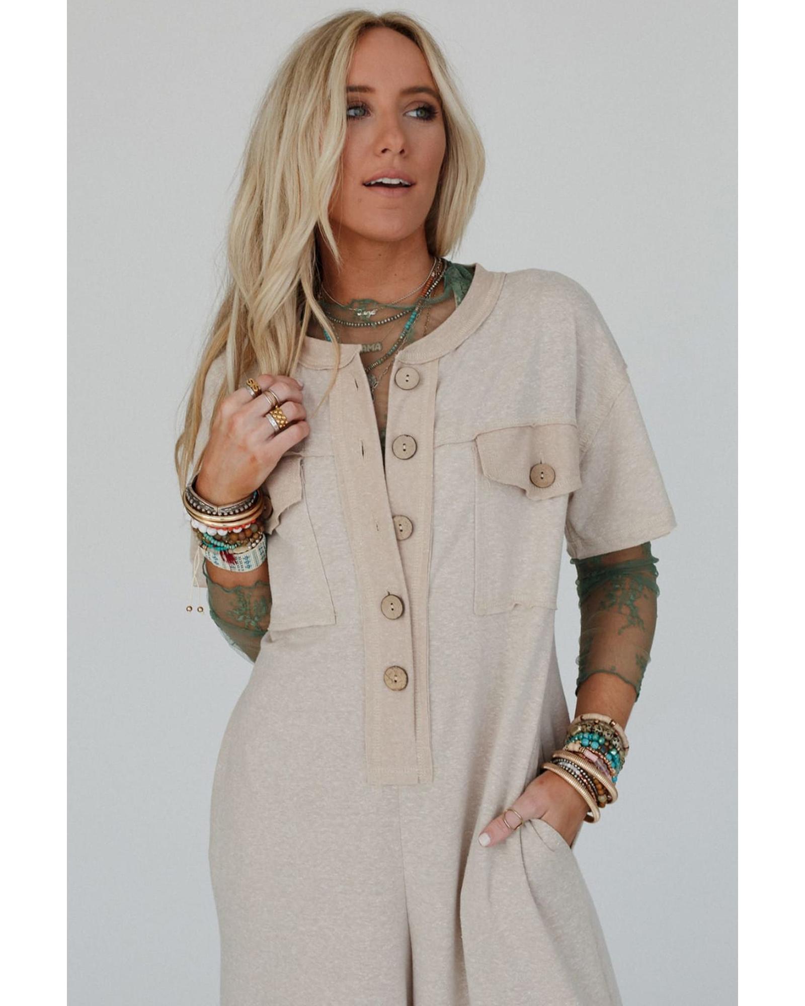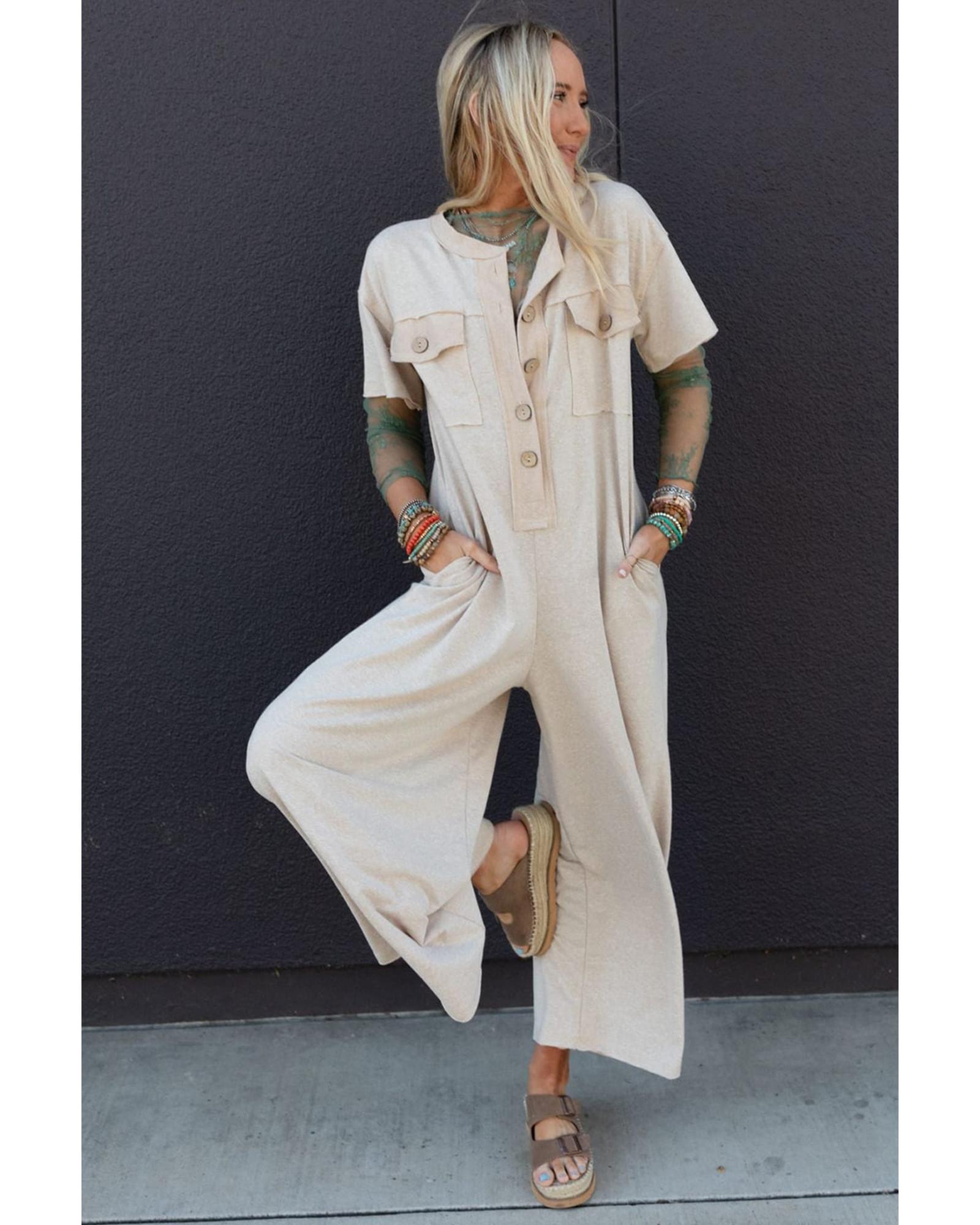 Beige Half Placket Chest Pockets Short Sleeve Wide Leg Jumpsuit – L