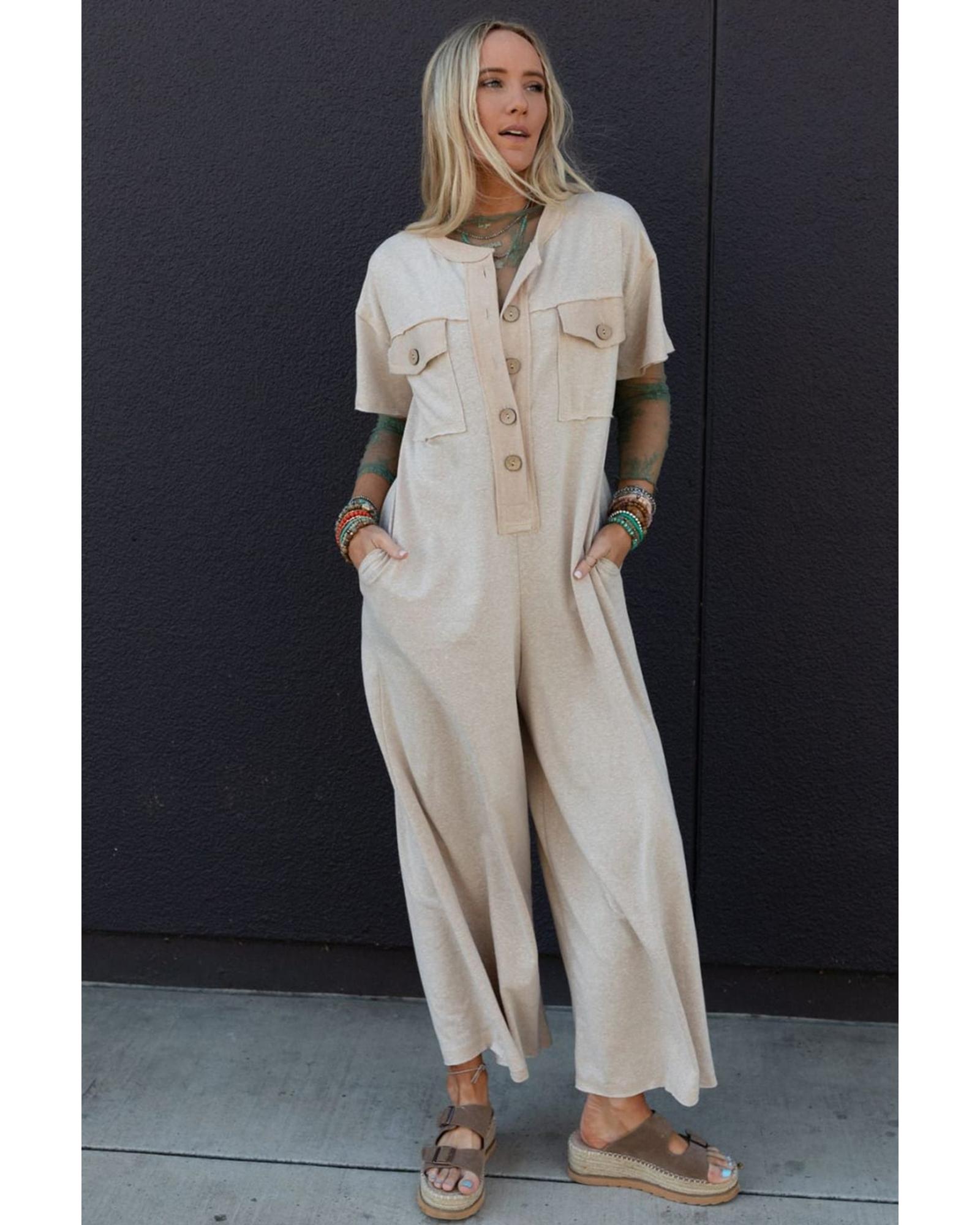 Beige Half Placket Chest Pockets Short Sleeve Wide Leg Jumpsuit – M