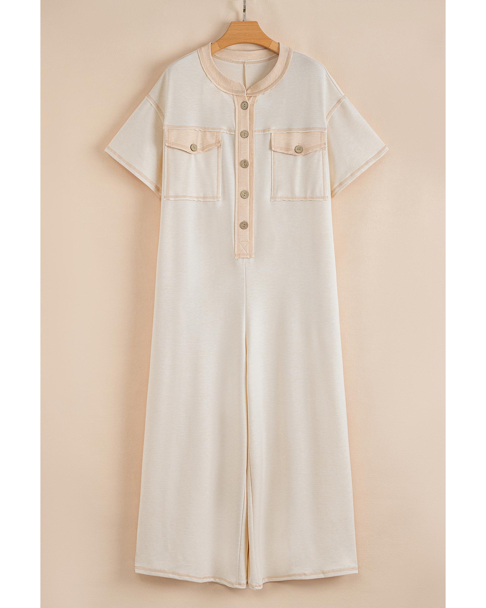 Beige Half Placket Chest Pockets Short Sleeve Wide Leg Jumpsuit – XL