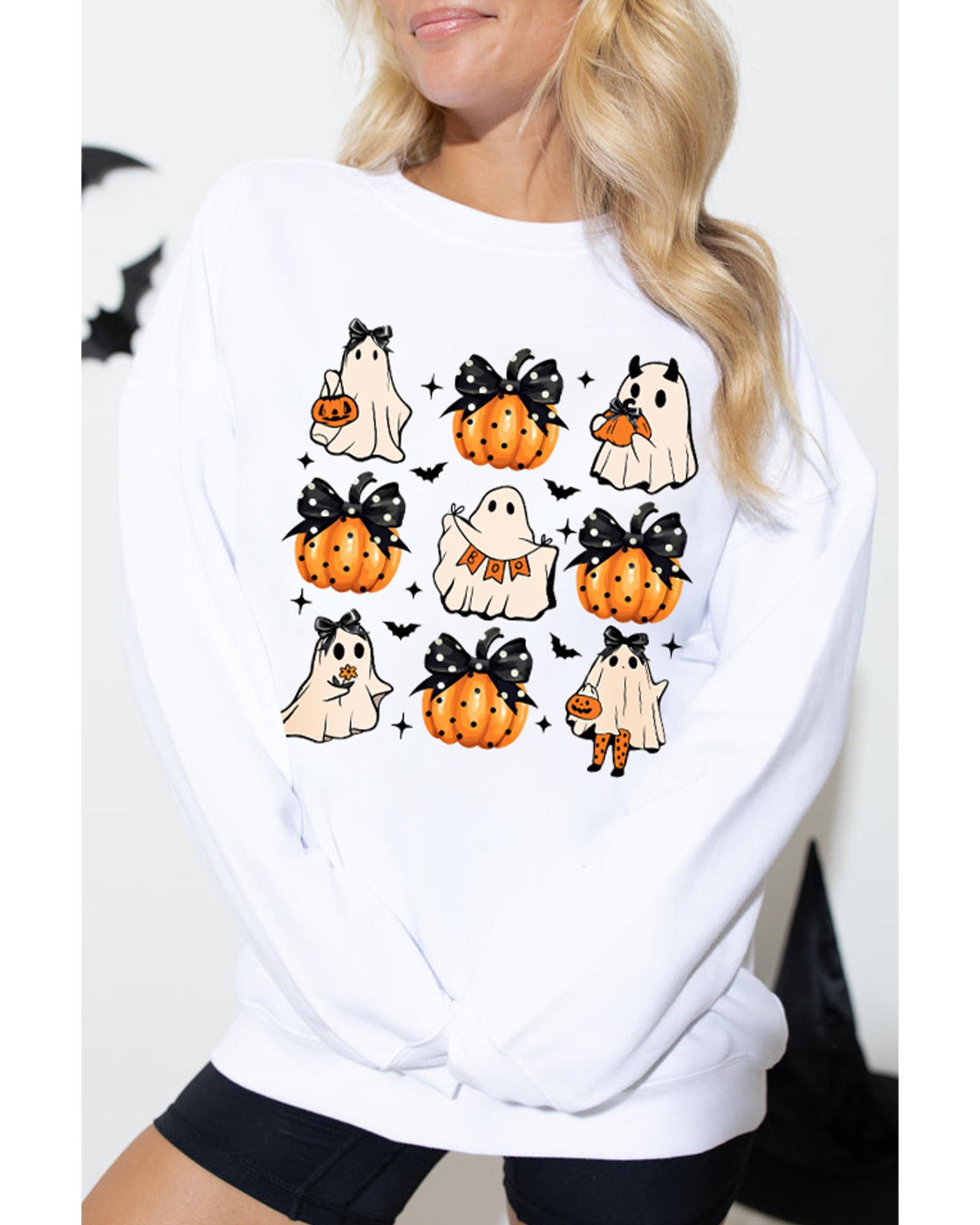 This beige Halloween sweatshirt features a festive ghost and pumpkin print, making it perfect for themed parties and celebrations. Designed with a relaxed fit, it offers comfort and style for various occasions during the holiday season.