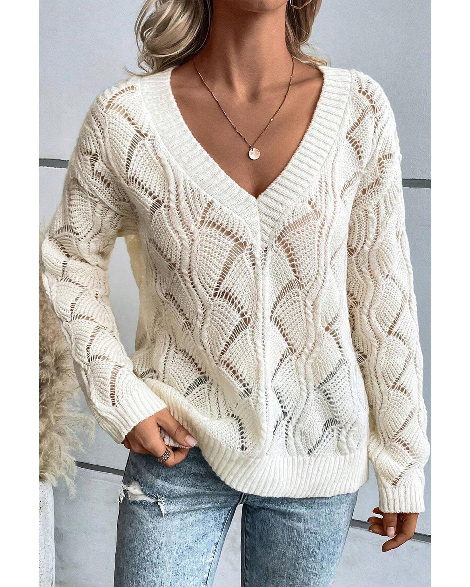 This beige hollow out knit V-neck drop shoulder sweater offers a trendy and versatile style suitable for various casual occasions. Its chic design features a hollow knit pattern and a relaxed drop shoulder fit, making it a comfortable and fashionable choice. The sweater pairs well with jeans or skirts, providing a stylish look for different outfits.
