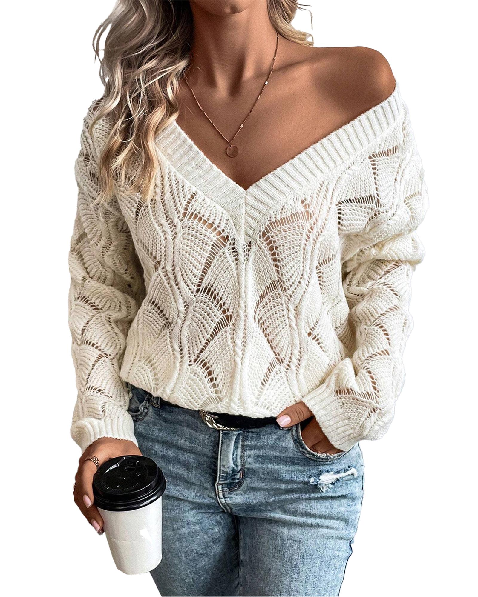 This beige hollow out knit V neck drop shoulder sweater offers a trendy and versatile style suitable for various casual occasions. Its comfortable fit and fashionable design make it a great addition to your wardrobe.