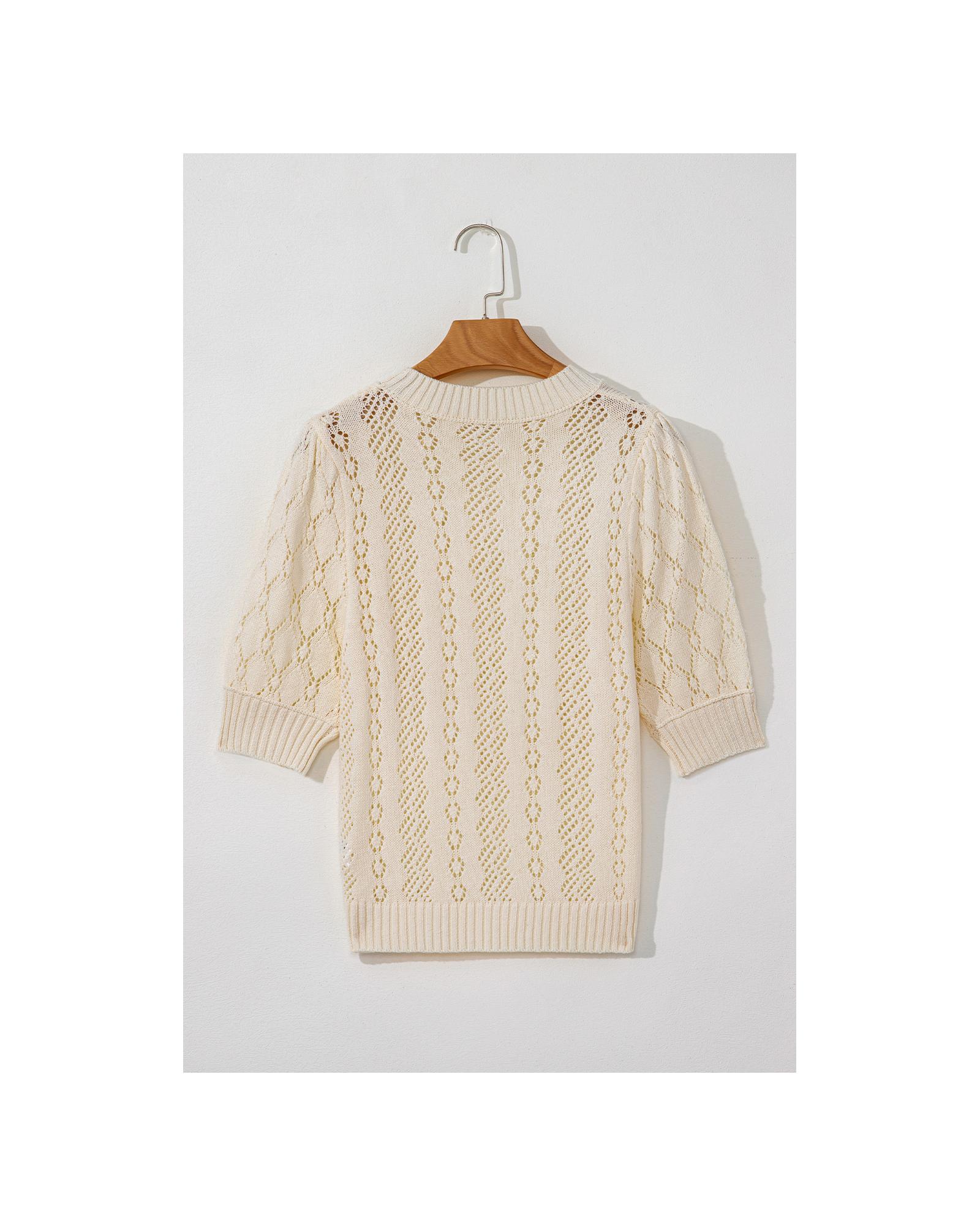 Beige Hollowed Pattern Knit Short Puff Sleeve Sweater – M