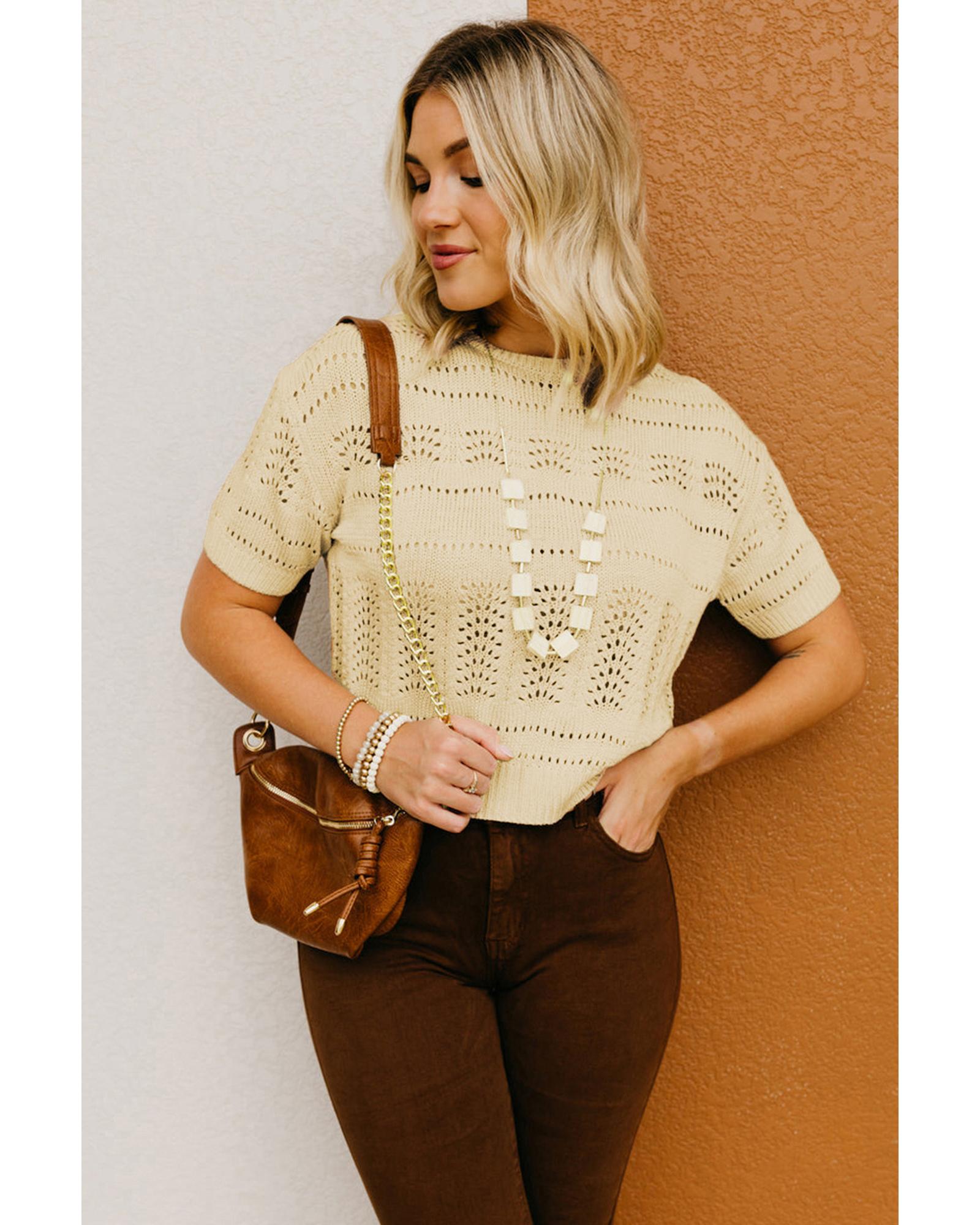 This beige knitted hollow-out short sleeve crop sweater offers a trendy and youthful style with a comfortable fit. Designed with a classic crew neck and featuring a captivating texture, it combines simplicity and versatility for various casual occasions.