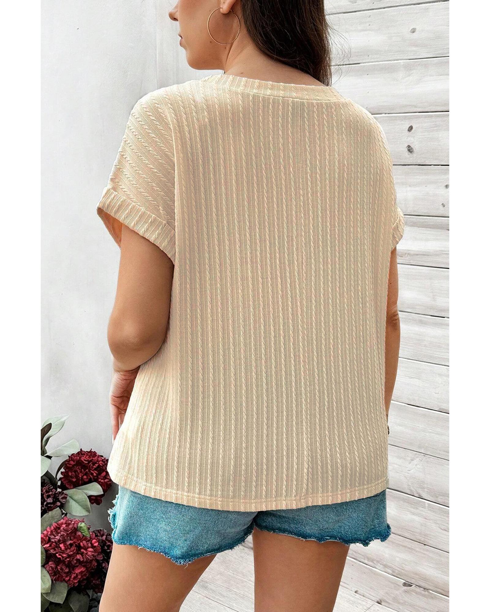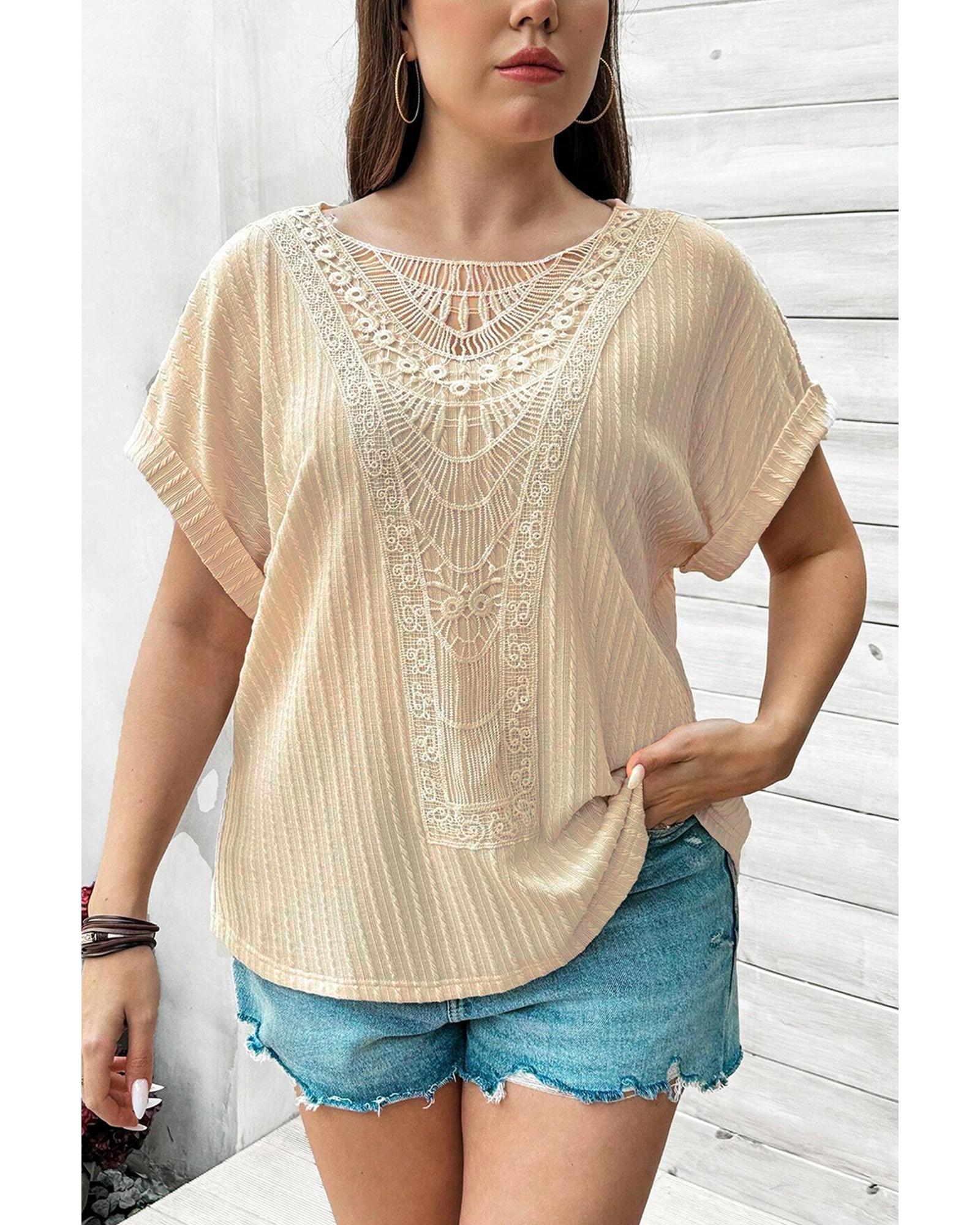 Beige Lace Crochet Patched Cable Textured Cuffed Short Sleeve Plus Size Top – 1X