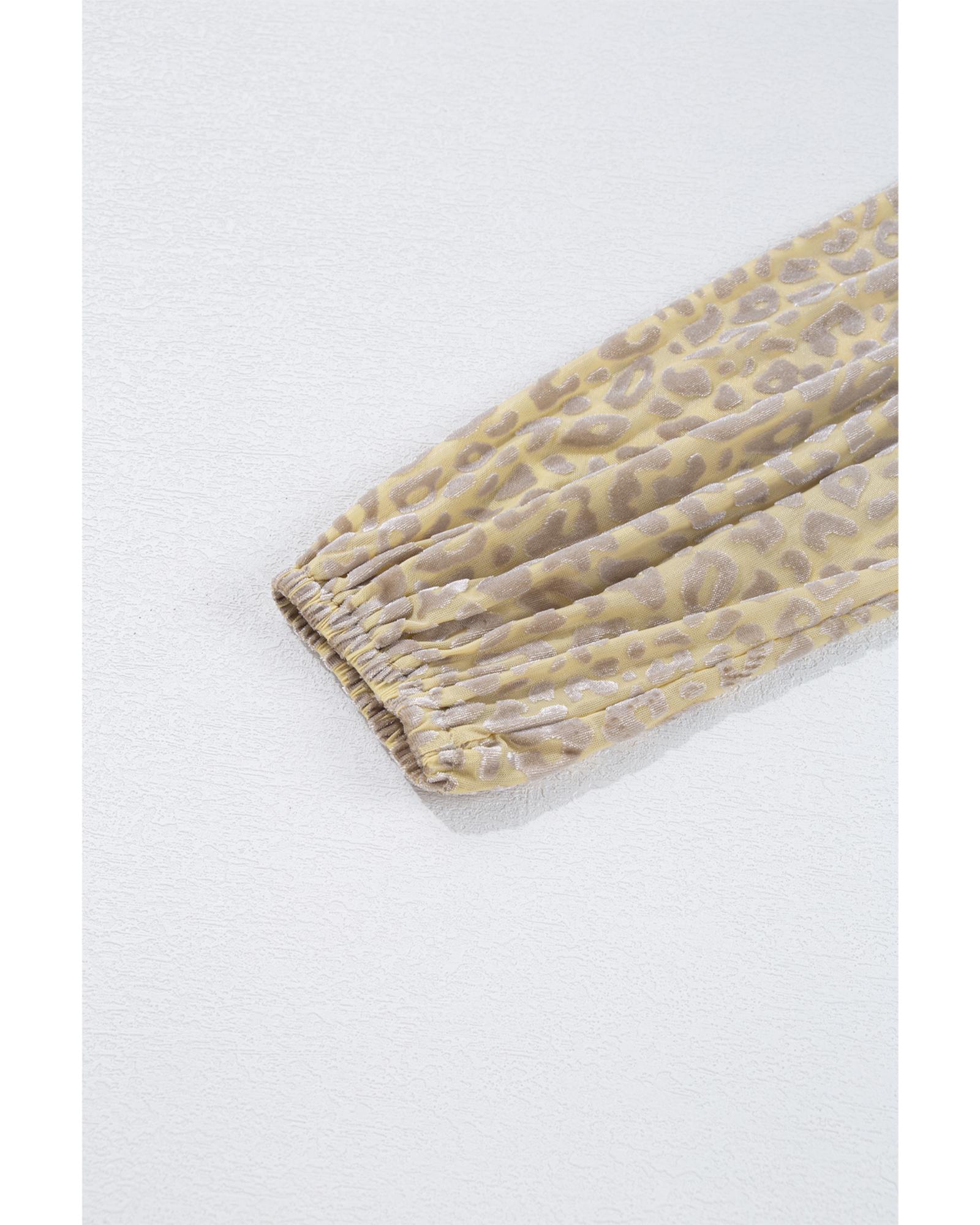 This stylish blouse features a trendy beige leopard velvet burnout design, perfect for adding a touch of sophistication to your wardrobe. The off-shoulder style and long puff sleeves create a fashionable silhouette, making it suitable for various occasions.