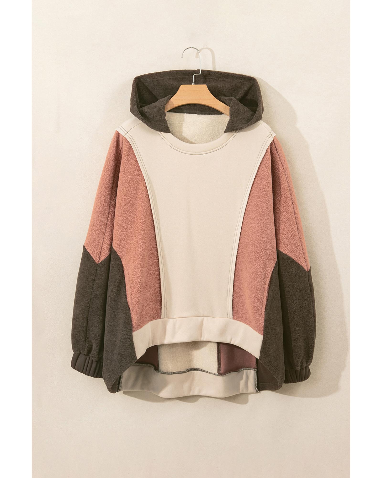 This beige oversized hoodie features a trendy color block and patchwork design with a high-low hem, offering a stylish and comfortable fit. Its crew neck and oversized silhouette make it suitable for casual wear and layering.