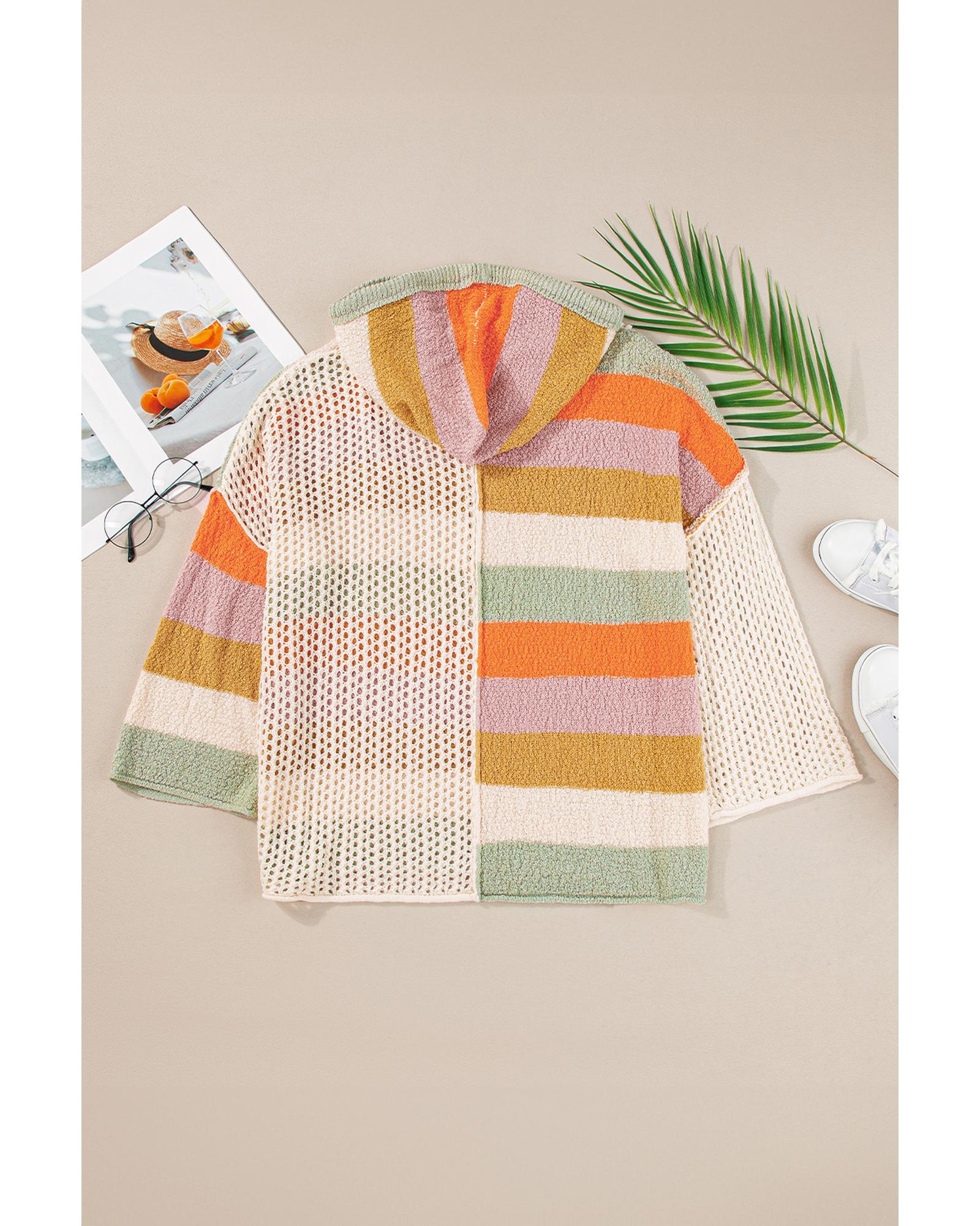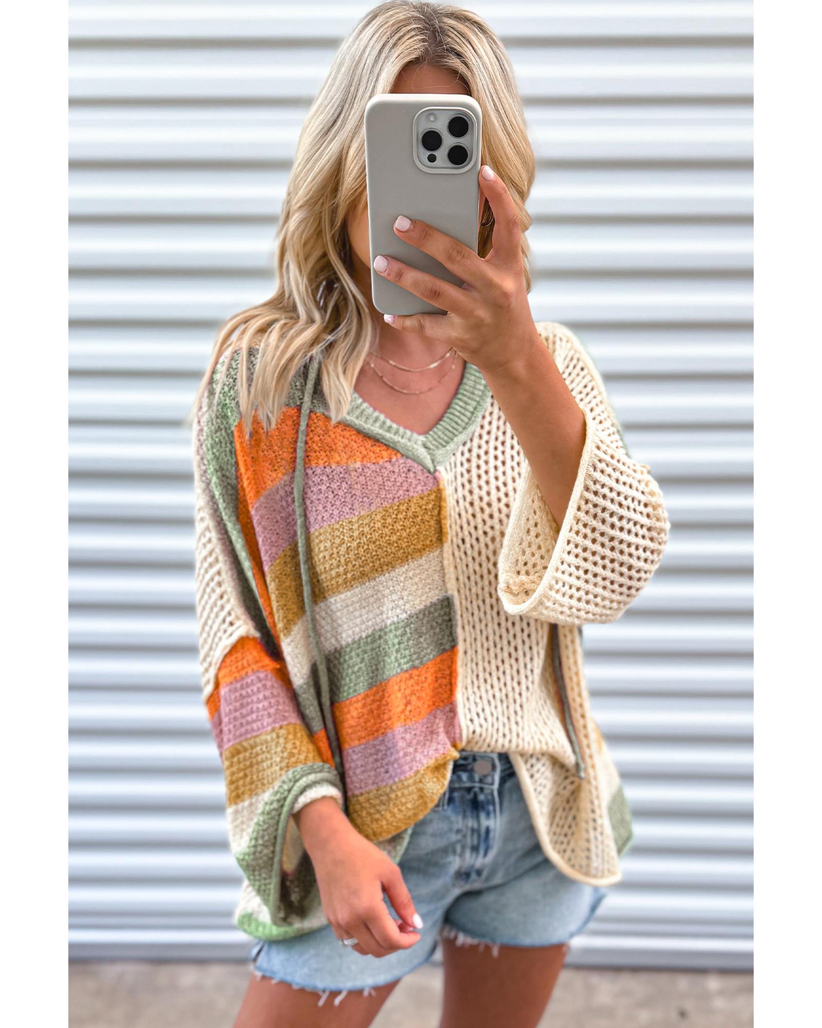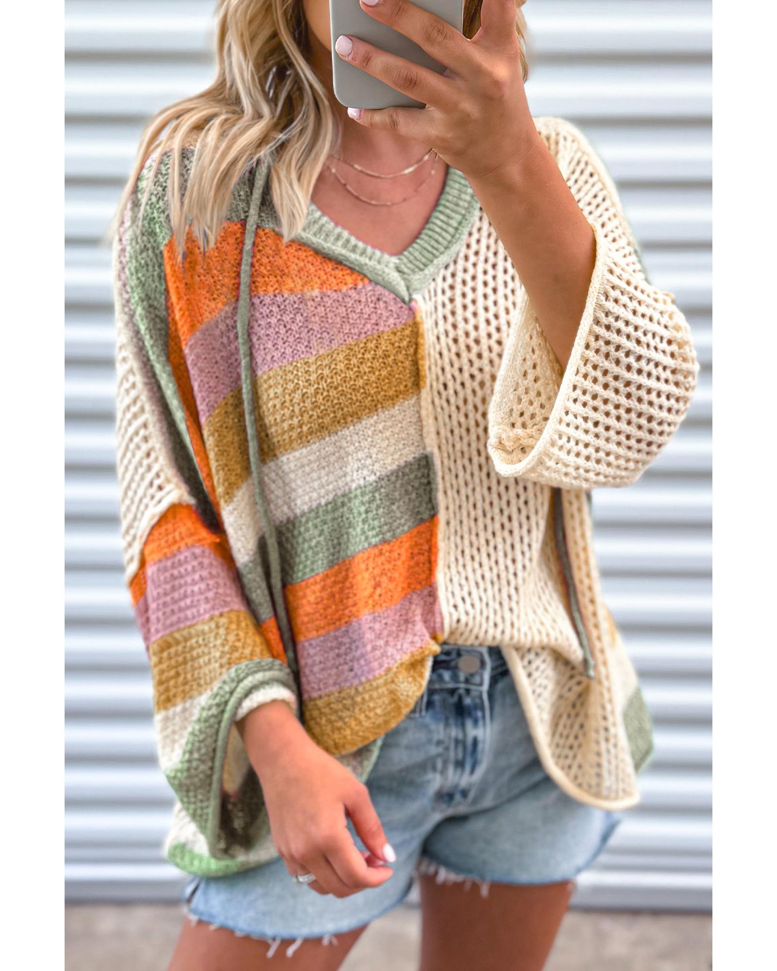 This oversized colorblock V neck hooded sweater offers a trendy and relaxed fit, making it a versatile addition to any wardrobe. Its eye-catching design features a hollowed patchwork pattern and a stylish colorblock pattern, suitable for various occasions.